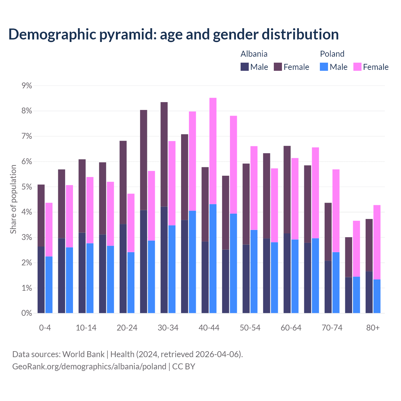 The share of older people aged 65 and over is 16.9% in Albania and 20.1% in Poland. Life expectancy in Albania compared to Poland .