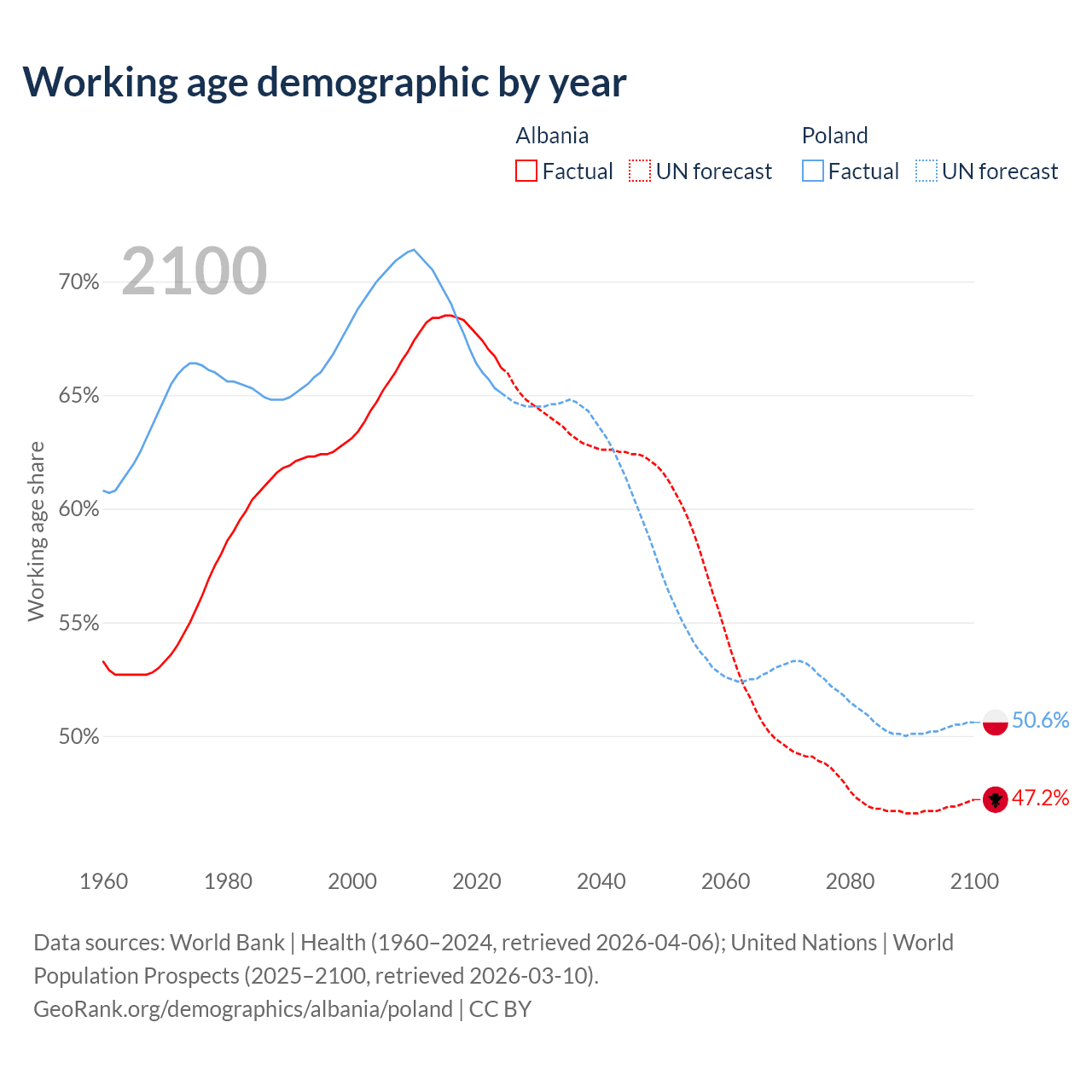 Median age Albania vs Poland, 1960-2100