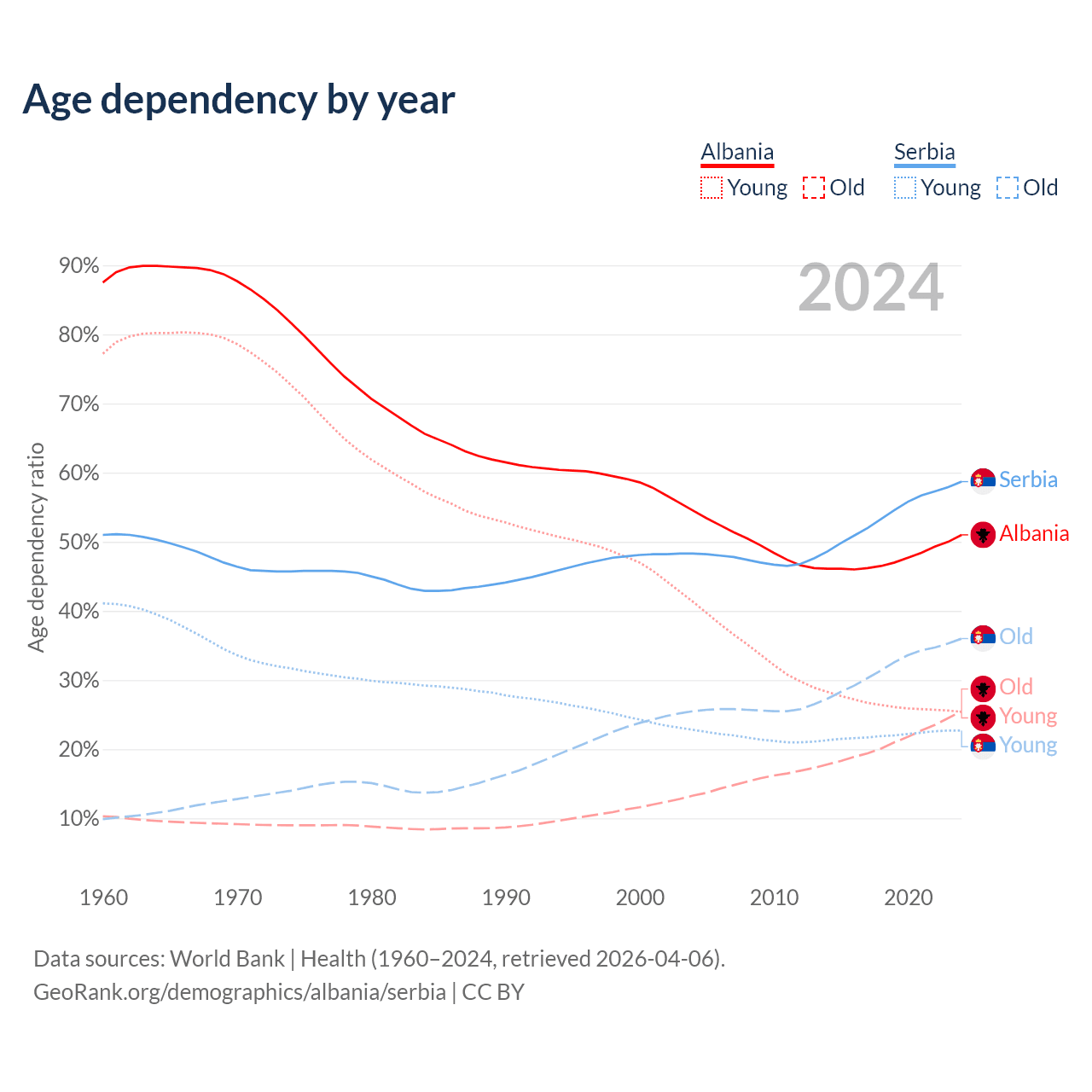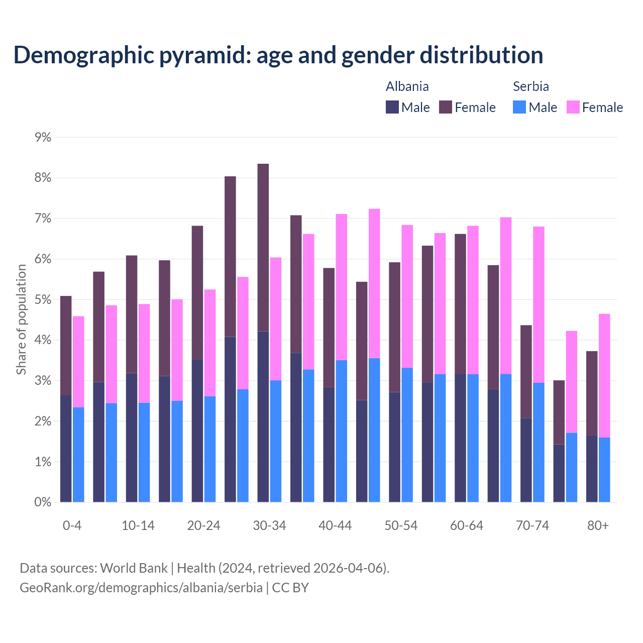- Albania is ranked 60/196 by median age (oldest to youngest) vs 15/196 for Serbia.