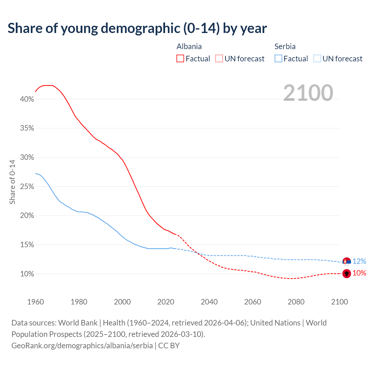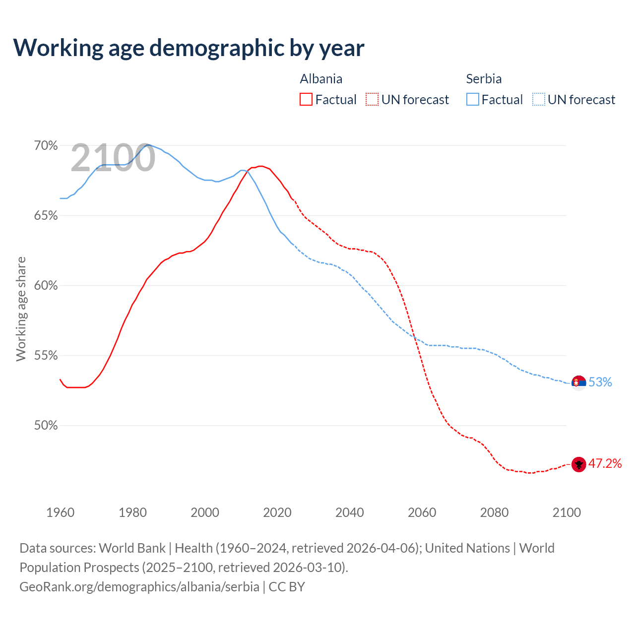 Median age Albania vs Serbia, 1960-2100