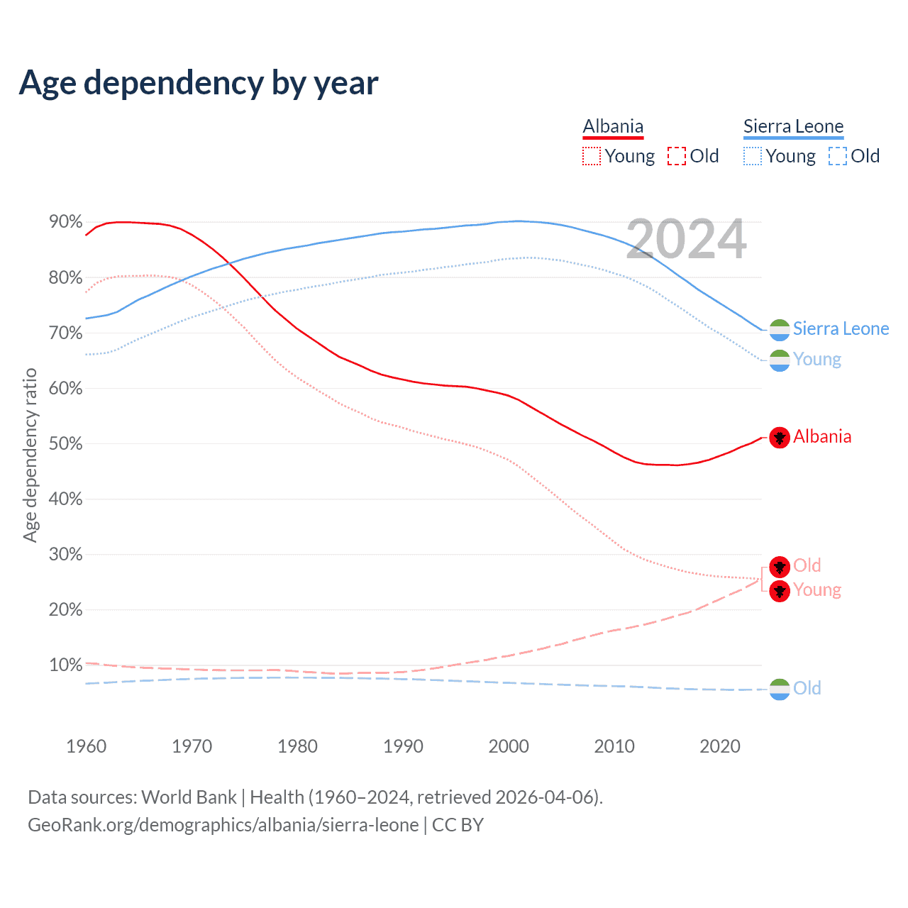 - The share of old-age demographic (65+) in Albania is 16.9% vs 3.24% in Sierra Leone.