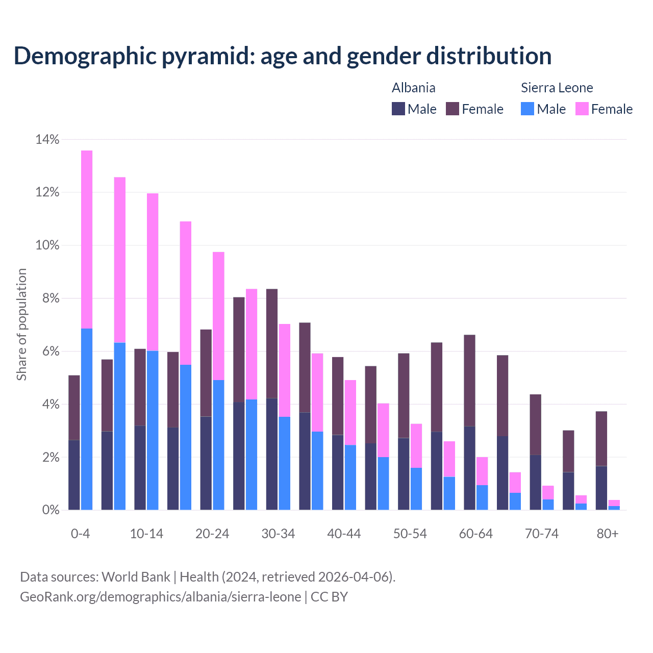 - As of 2026, the population of Albania is 2.34M vs 9.05M in Sierra Leone - 3.86 times difference.