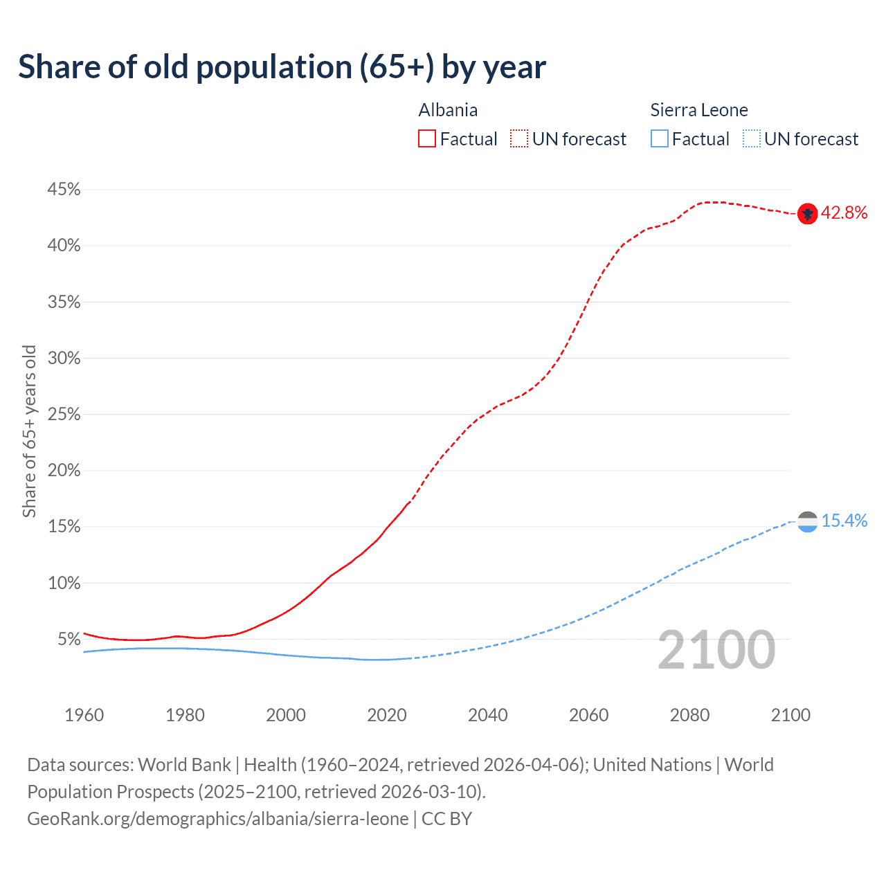 The share of older people aged 65 and over is 16.9% in Albania and 3.24% in Sierra Leone. Life expectancy in Albania compared to Sierra Leone .