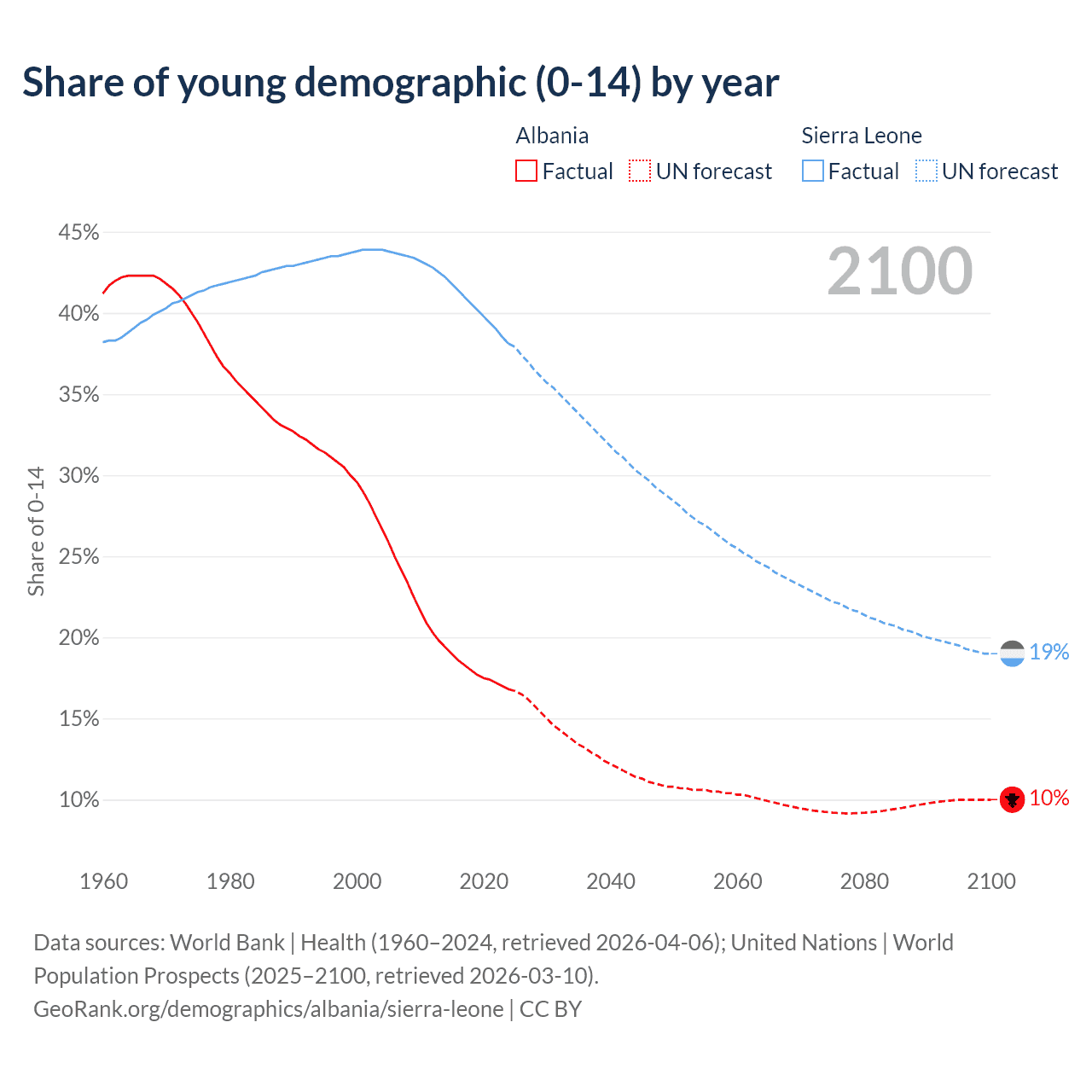 - The share of young demographic (0-15 years old) in Albania is 16.8% vs 38.1% in Sierra Leone.