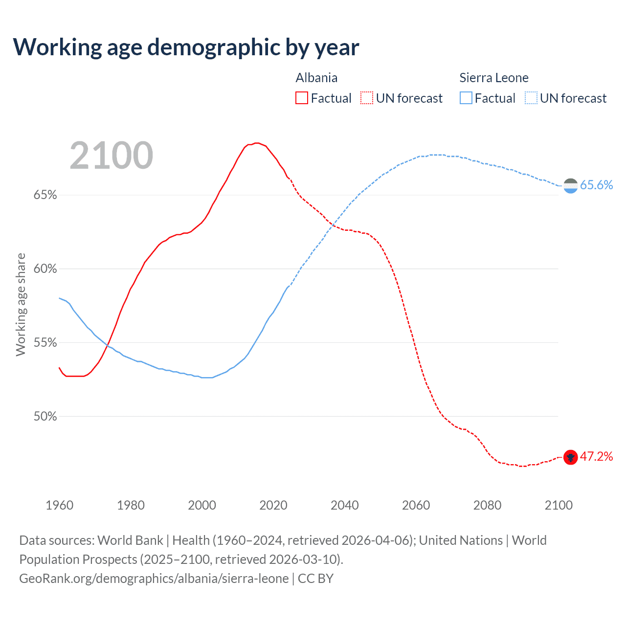 - Albania has 1.55M working age adults (aged 15-64) vs 5.31M in Sierra Leone.