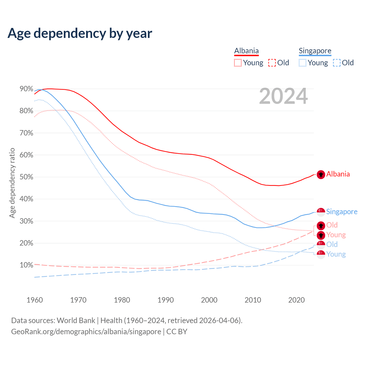- Albania is ranked 60/196 by median age (oldest to youngest) vs 68/196 for Singapore.