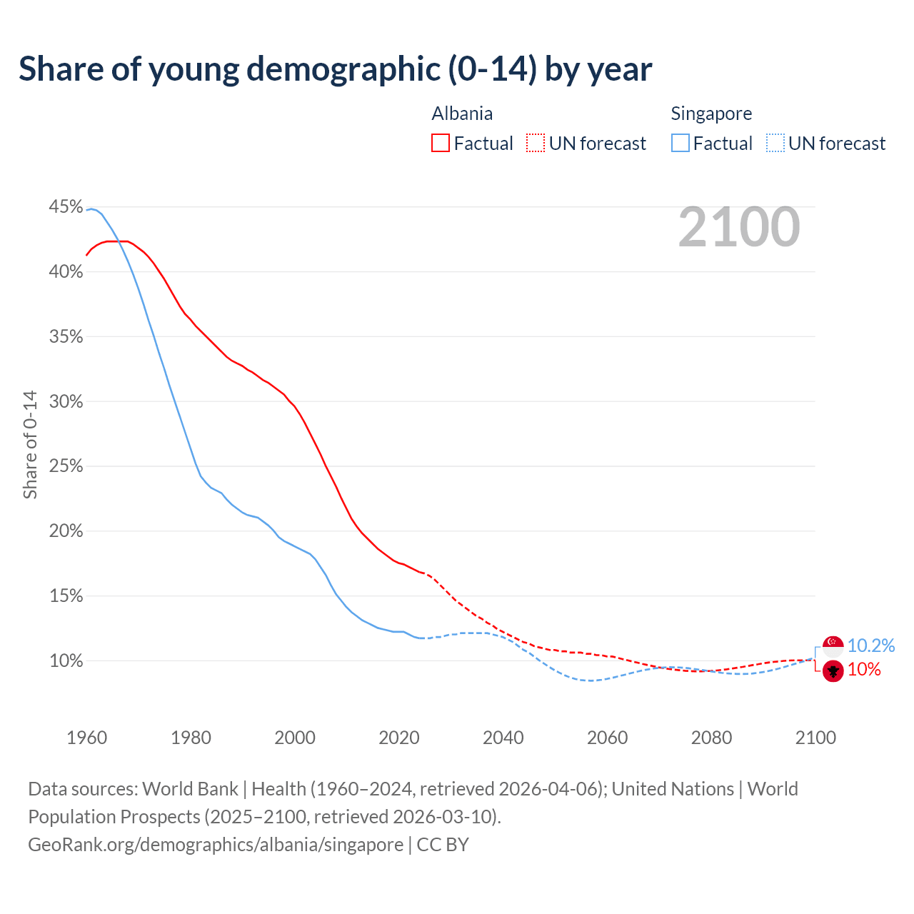 - The share of young demographic (0-15 years old) in Albania is 16.8% vs 11.7% in Singapore.