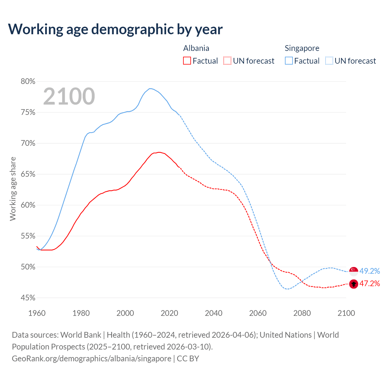 Median age Albania vs Singapore, 1960-2100