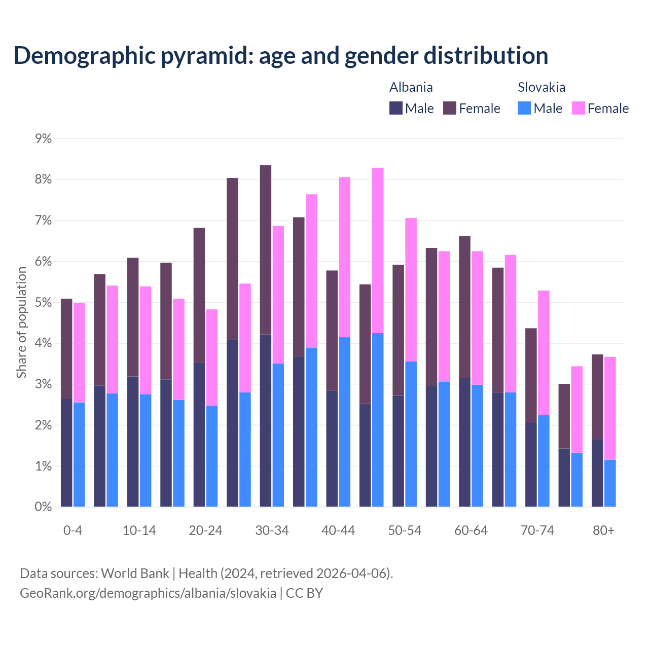- Albania is ranked 60/196 by median age (oldest to youngest) vs 31/196 for Slovakia.