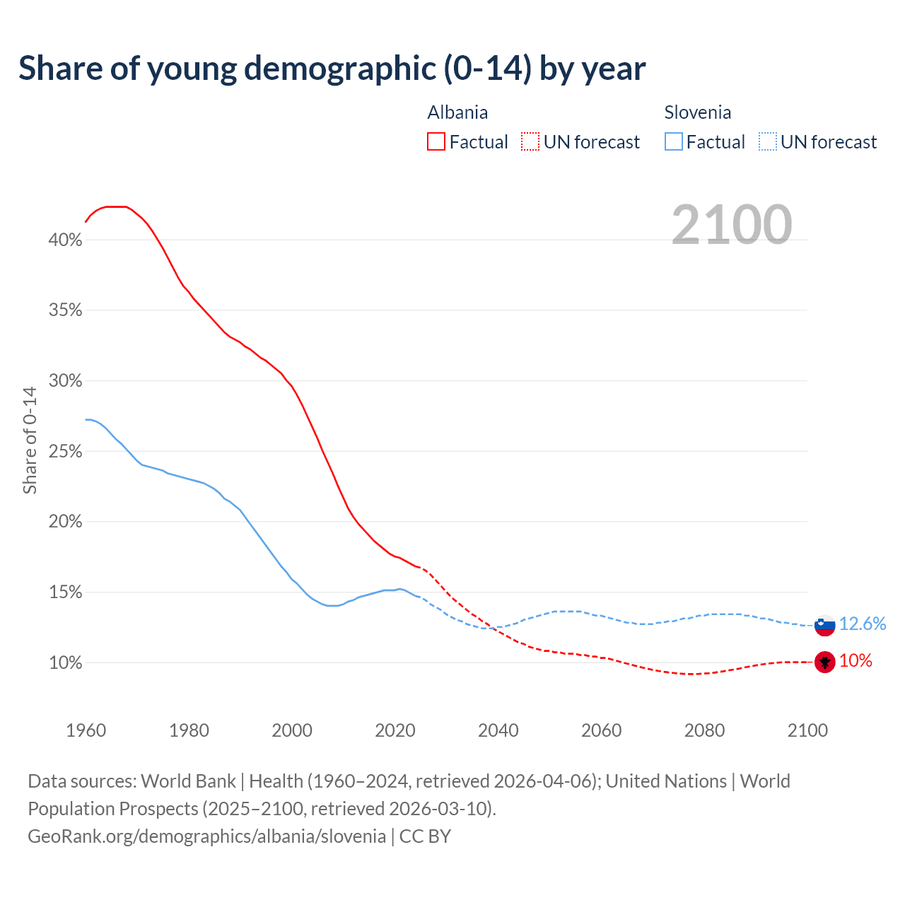 - The share of young demographic (0-15 years old) in Albania is 16.8% vs 14.7% in Slovenia.