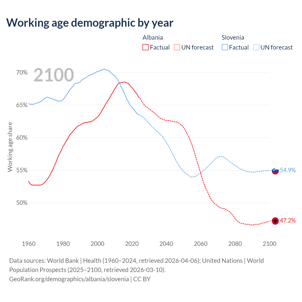 - Albania has 1.55M working age adults (aged 15-64) vs 1.35M in Slovenia.