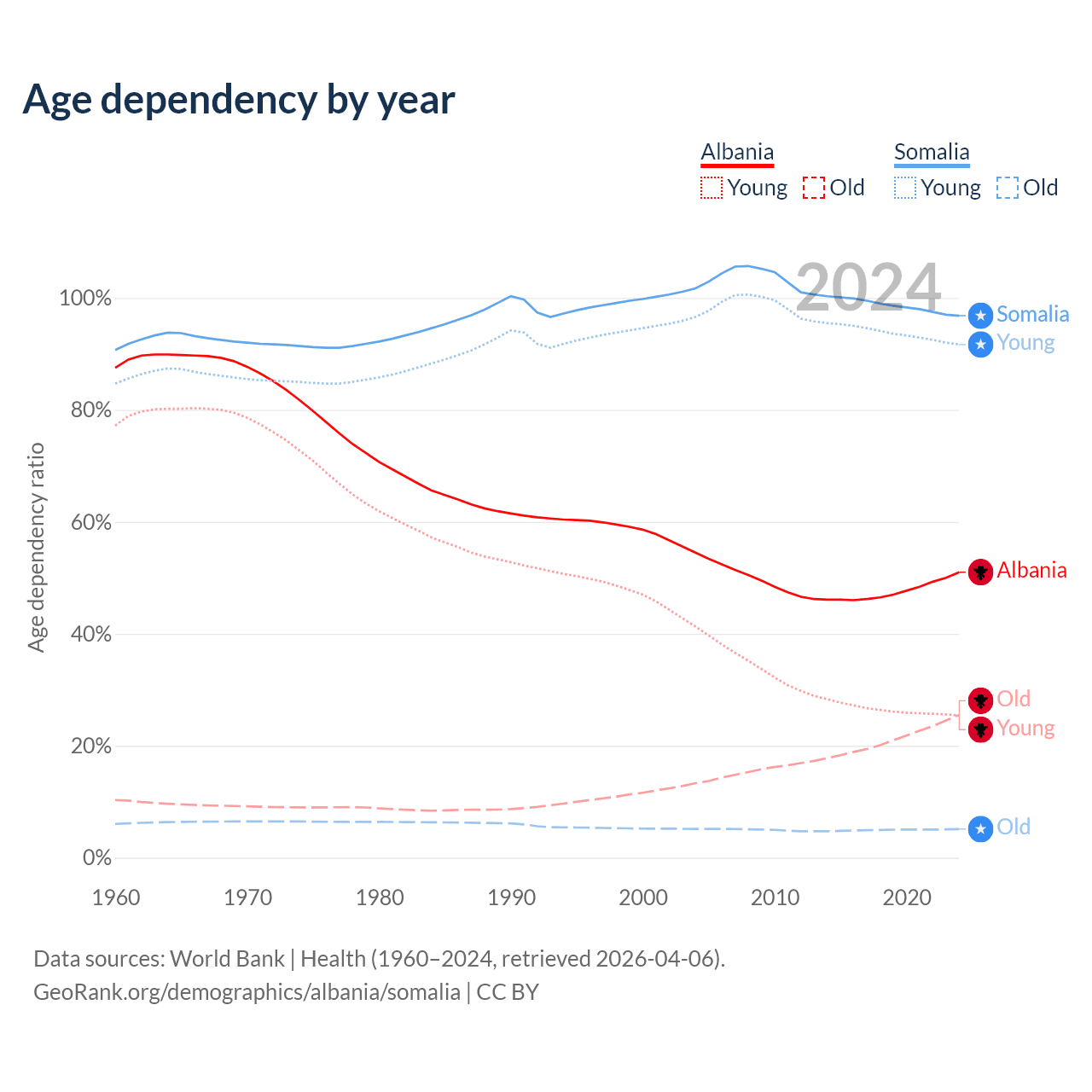 - Albania is ranked 60/196 by median age (oldest to youngest) vs 194/196 for Somalia.