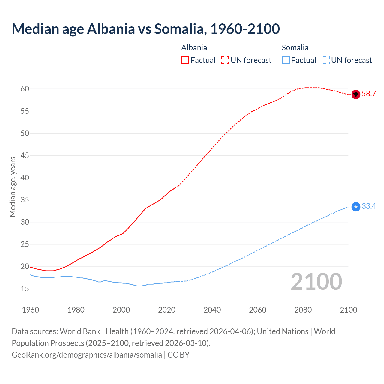 Median age Albania vs Somalia, 1960-2100