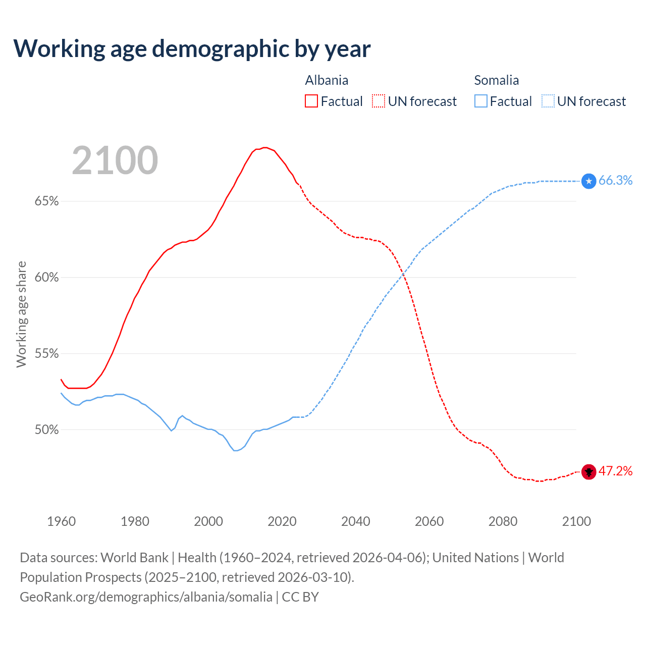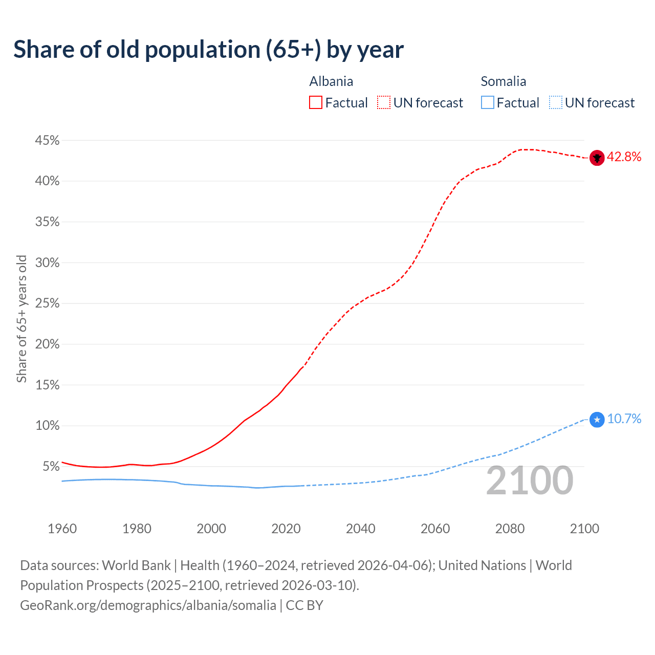 - The share of old-age demographic (65+) in Albania is 16.9% vs 2.59% in Somalia.