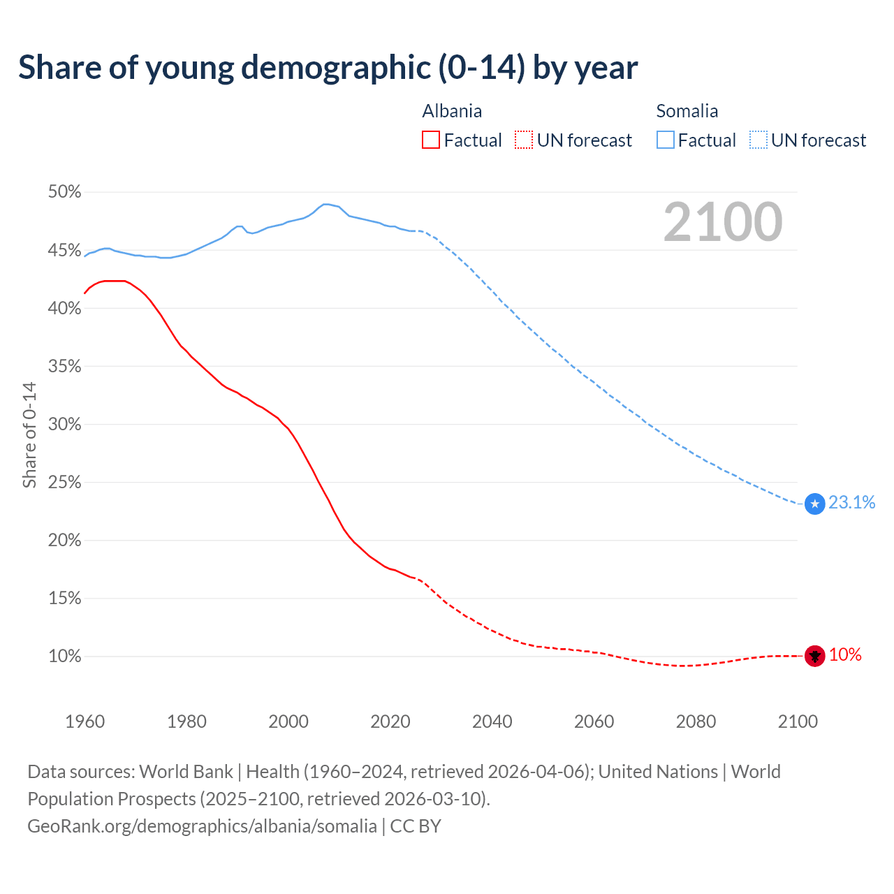 - The share of young demographic (0-15 years old) in Albania is 16.8% vs 46.6% in Somalia.