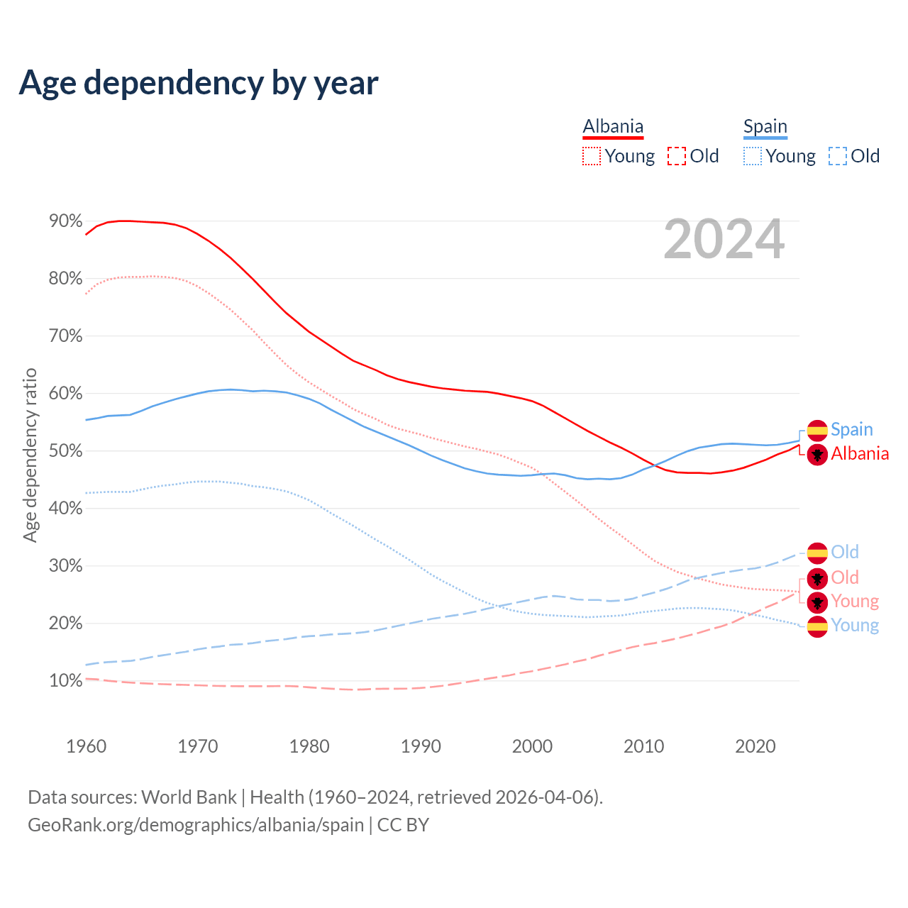 - Albania is ranked 60/196 by median age (oldest to youngest) vs 7/196 for Spain.