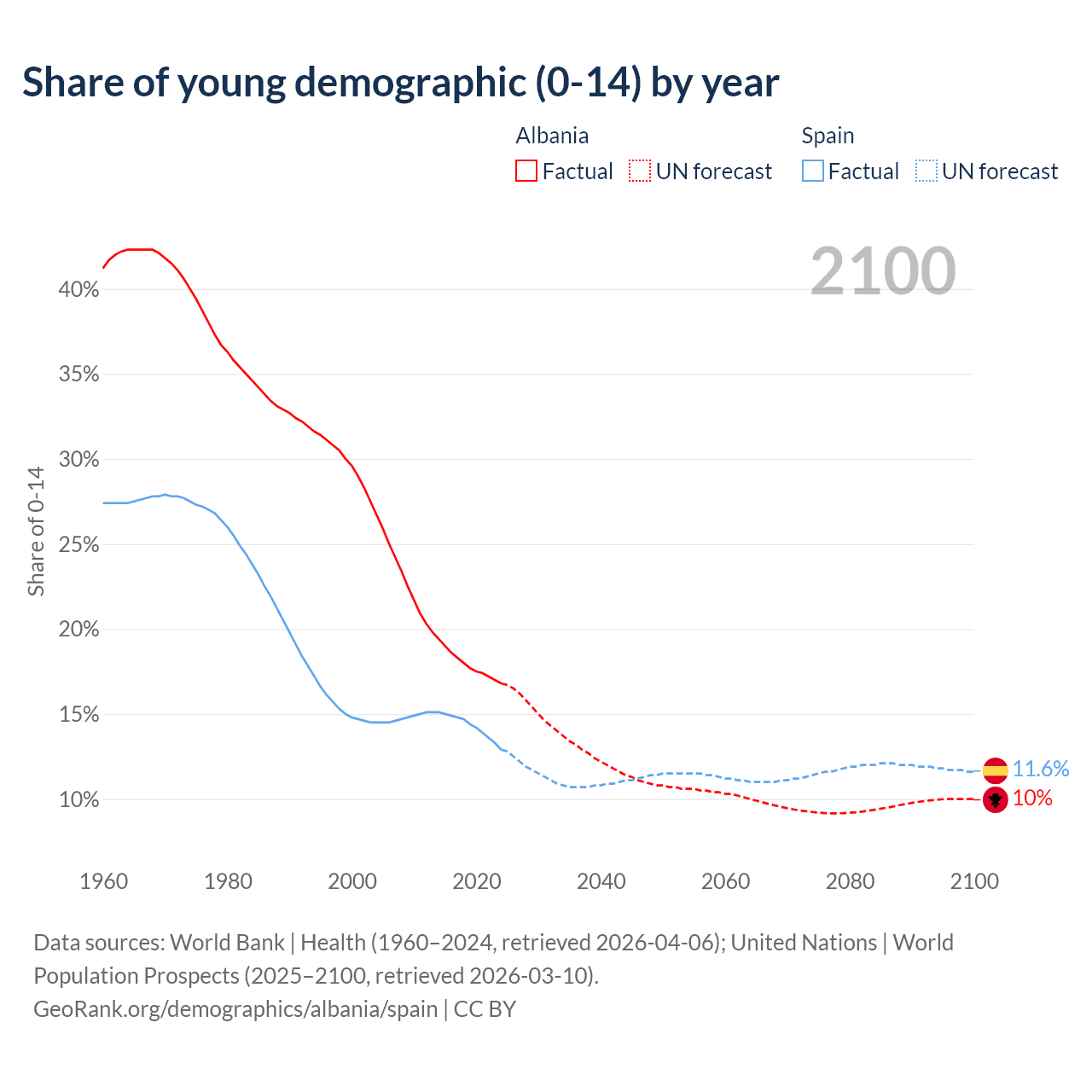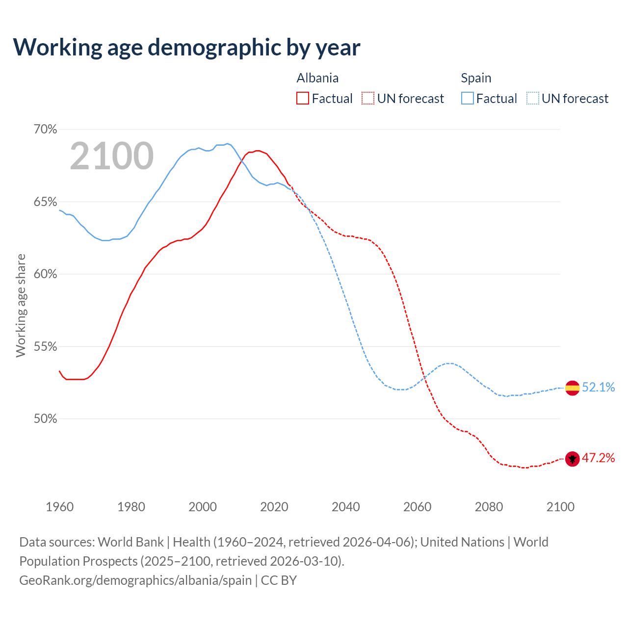 Median age Albania vs Spain, 1960-2100