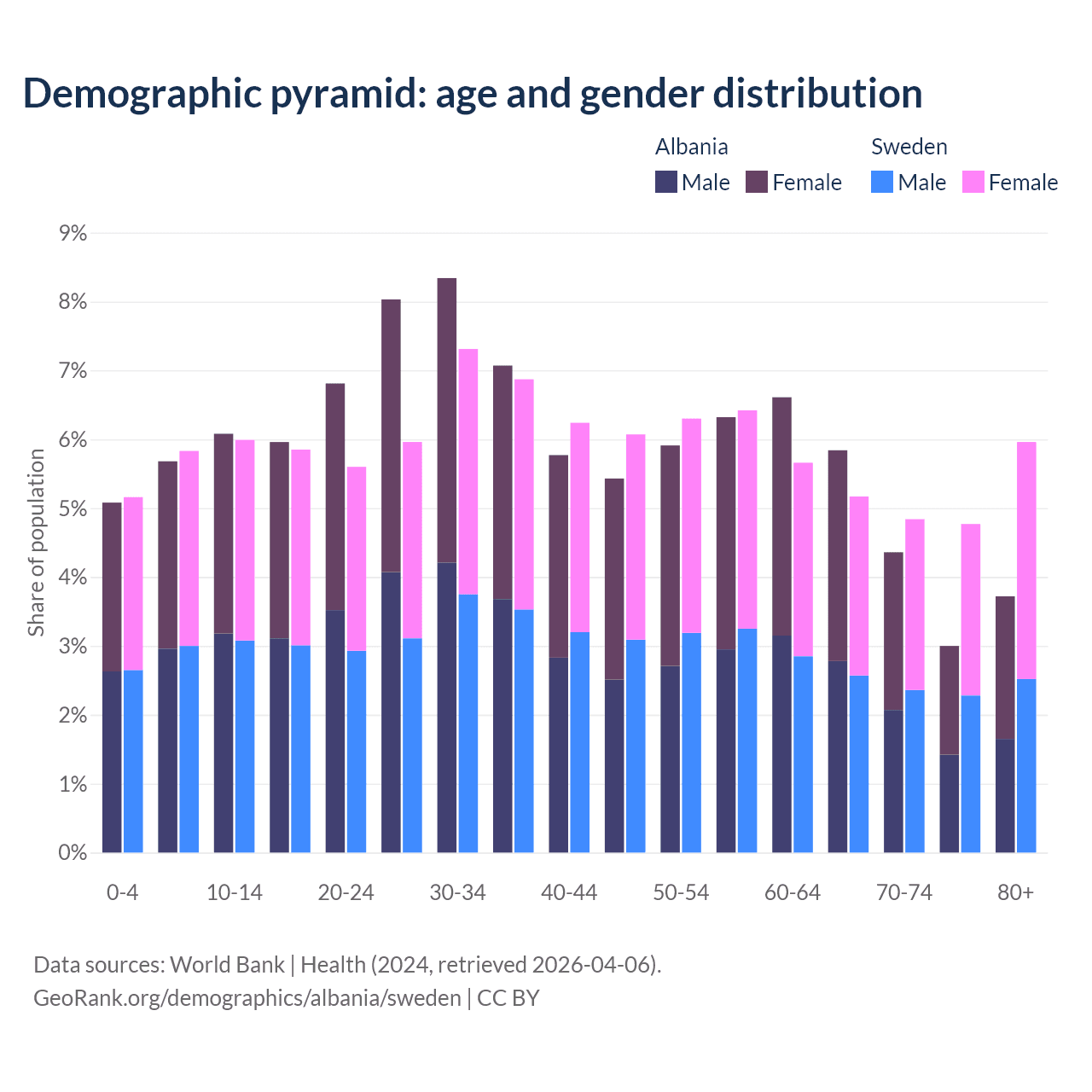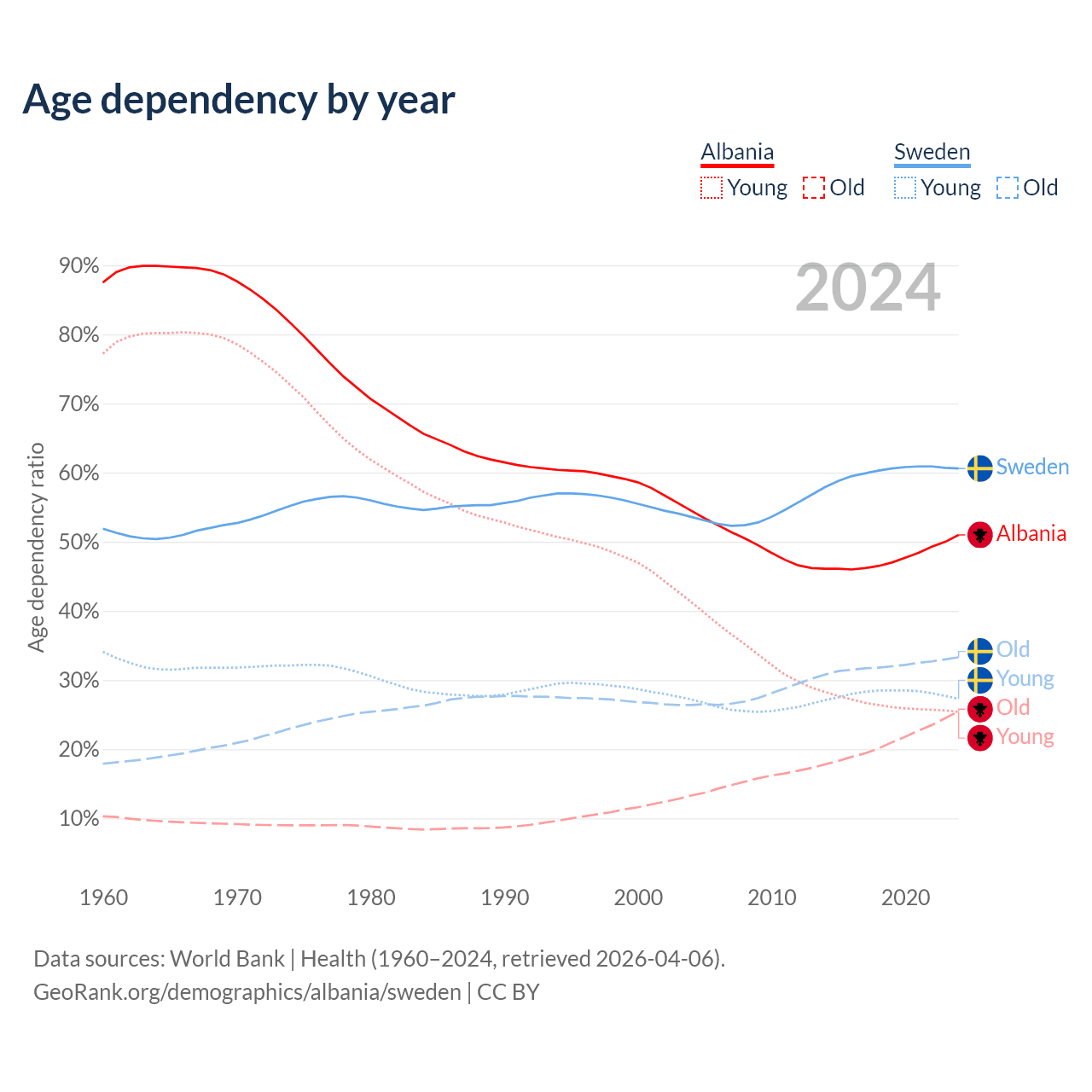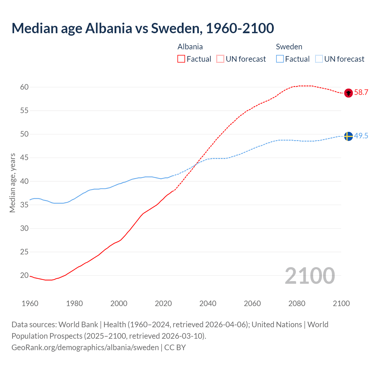 - Albania is ranked 60/196 by median age (oldest to youngest) vs 39/196 for Sweden.
