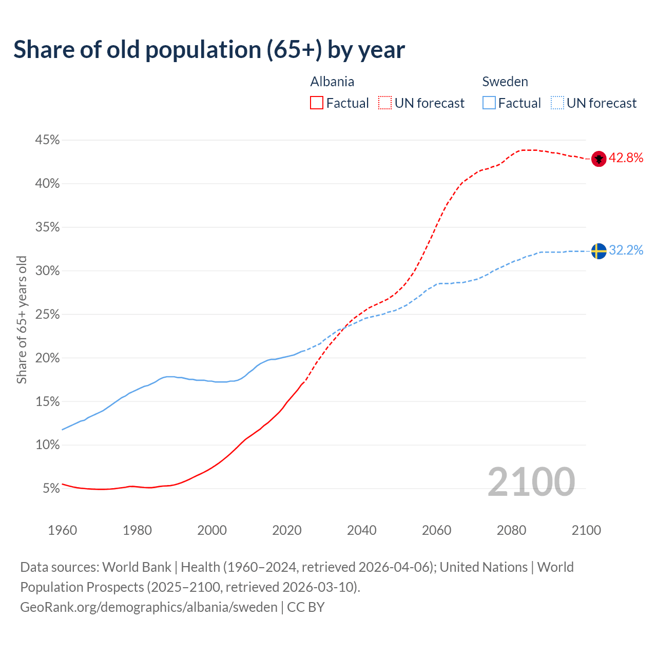 - The share of old-age demographic (65+) in Albania is 16.9% vs 20.7% in Sweden.