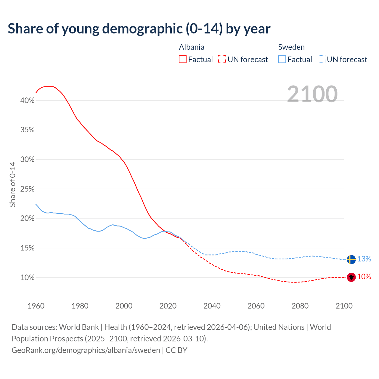 - The share of young demographic (0-15 years old) in Albania is 16.8% vs 17% in Sweden.