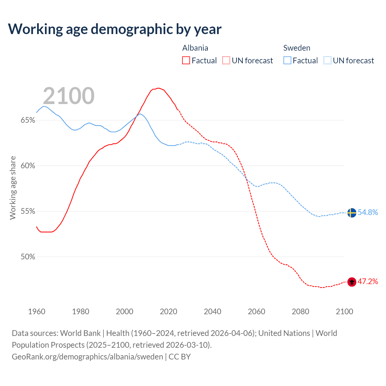 - Albania has 1.55M working age adults (aged 15-64) vs 6.65M in Sweden.