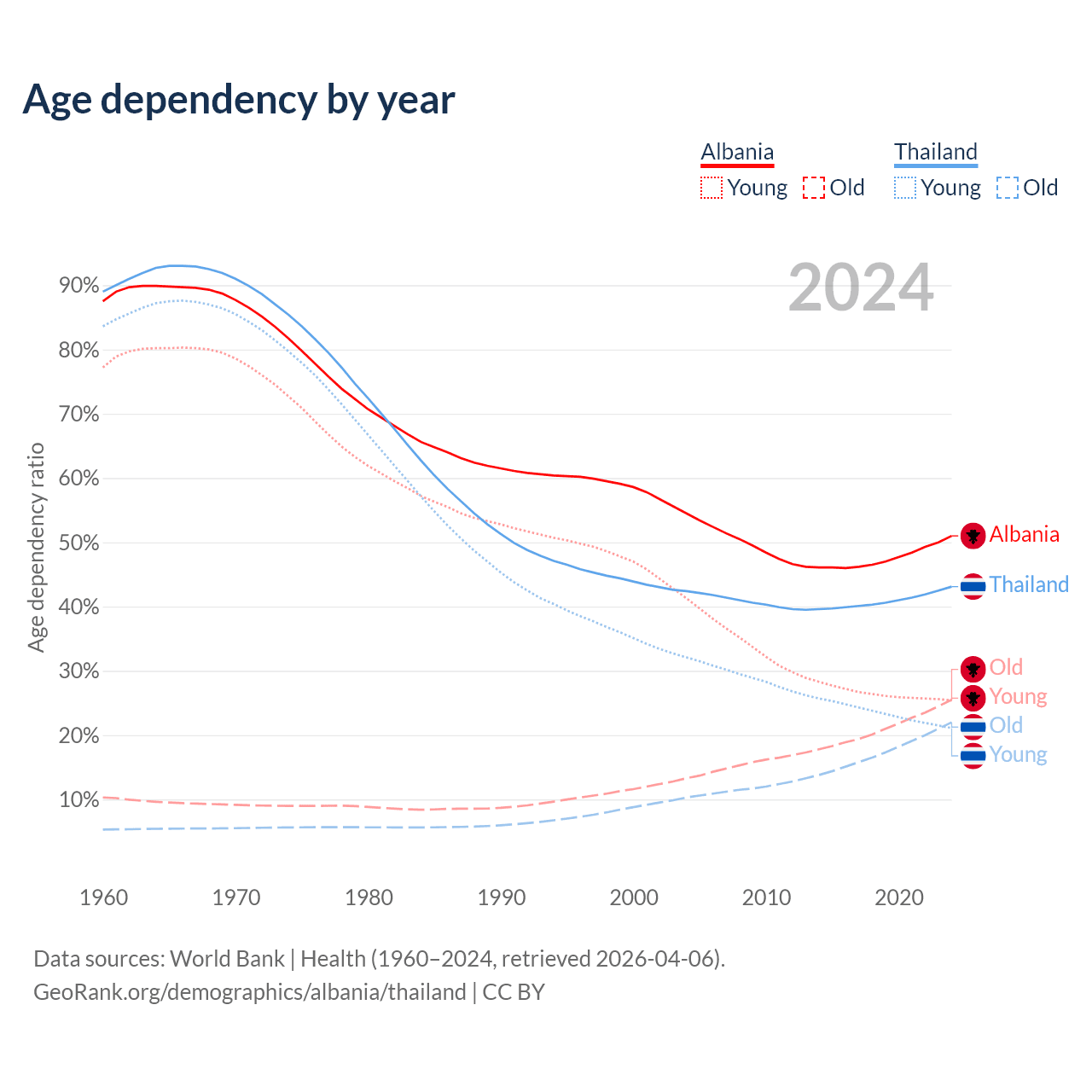 - Albania is ranked 60/196 by median age (oldest to youngest) vs 40/196 for Thailand.