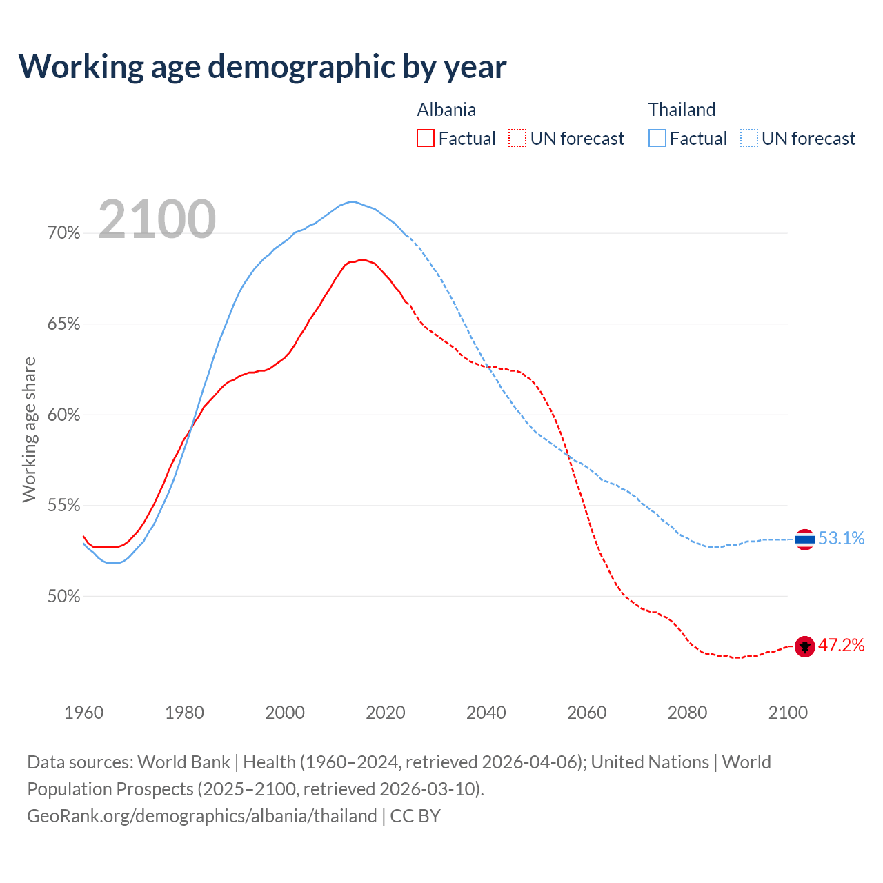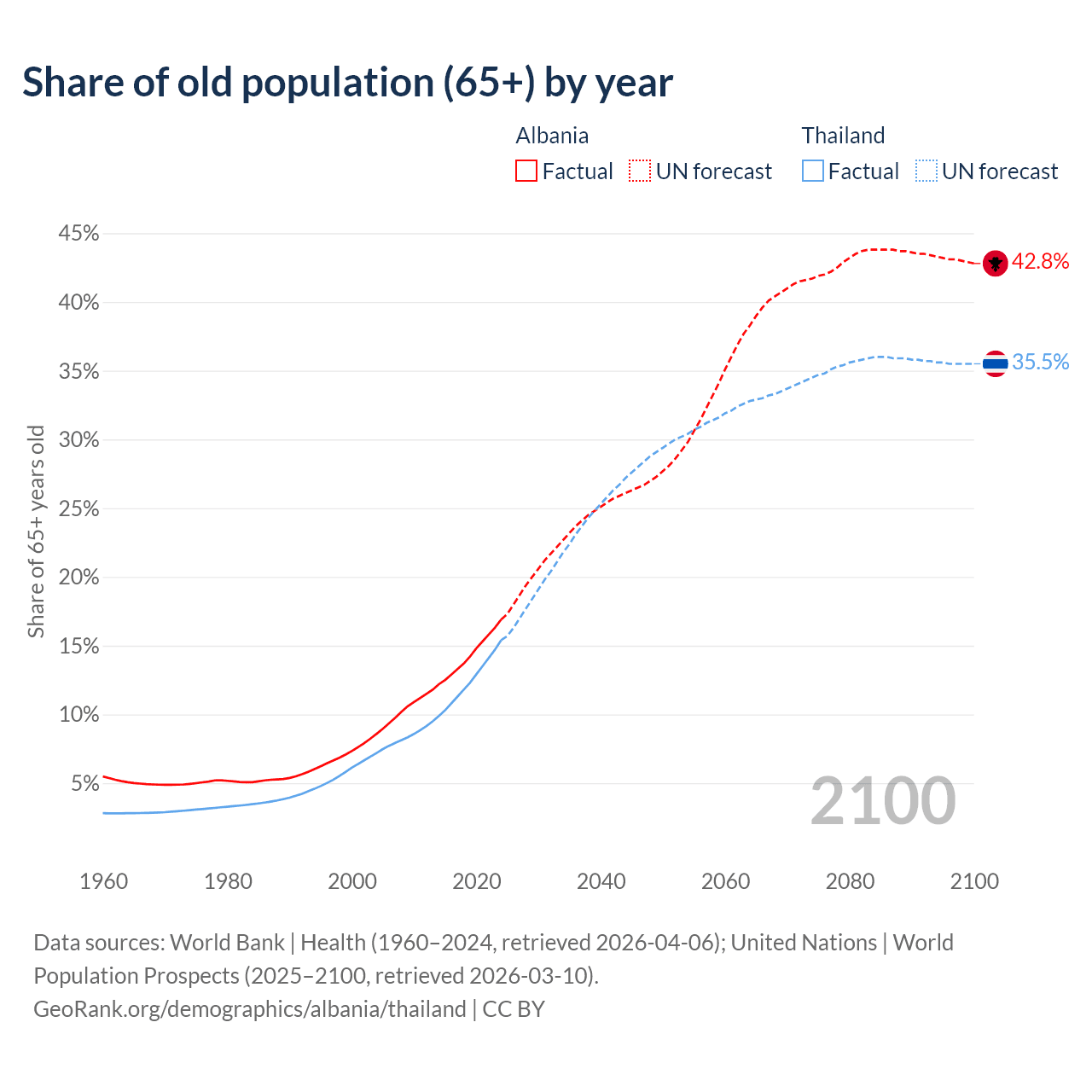 Median age Albania vs Thailand, 1960-2100
