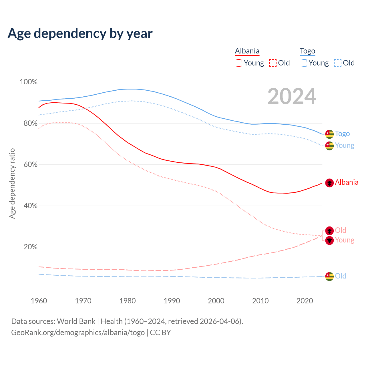 - The share of old-age demographic (65+) in Albania is 16.9% vs 3.21% in Togo.