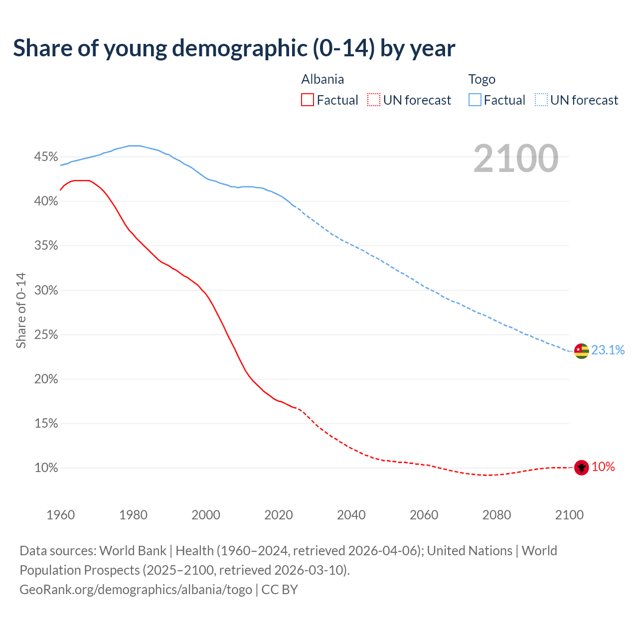 - The share of young demographic (0-15 years old) in Albania is 16.8% vs 39.5% in Togo.