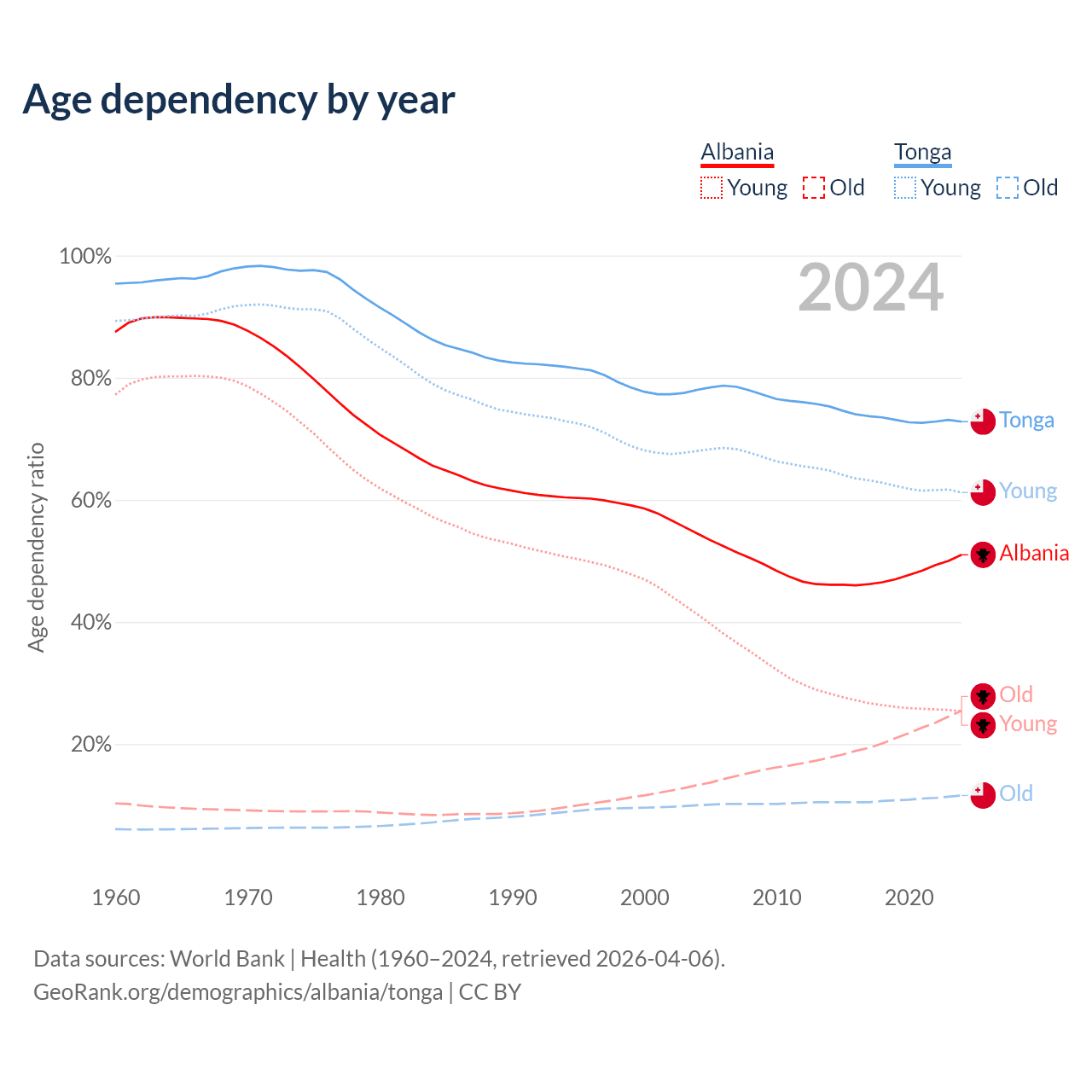 - The share of young demographic (0-15 years old) in Albania is 16.8% vs 35.4% in Tonga.