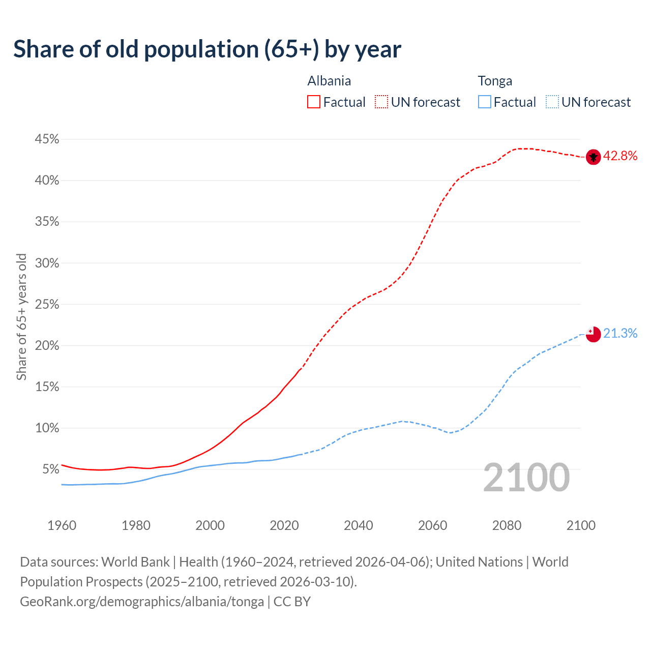 - The share of old-age demographic (65+) in Albania is 16.9% vs 6.72% in Tonga.