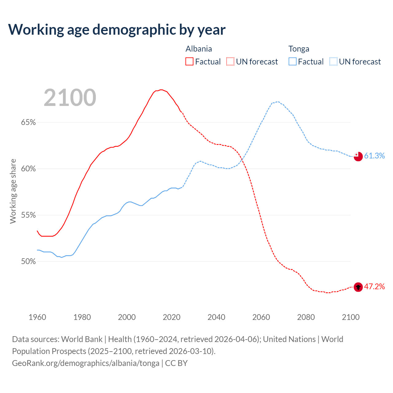 - Albania has 1.55M working age adults (aged 15-64) vs 59.8K in Tonga.
