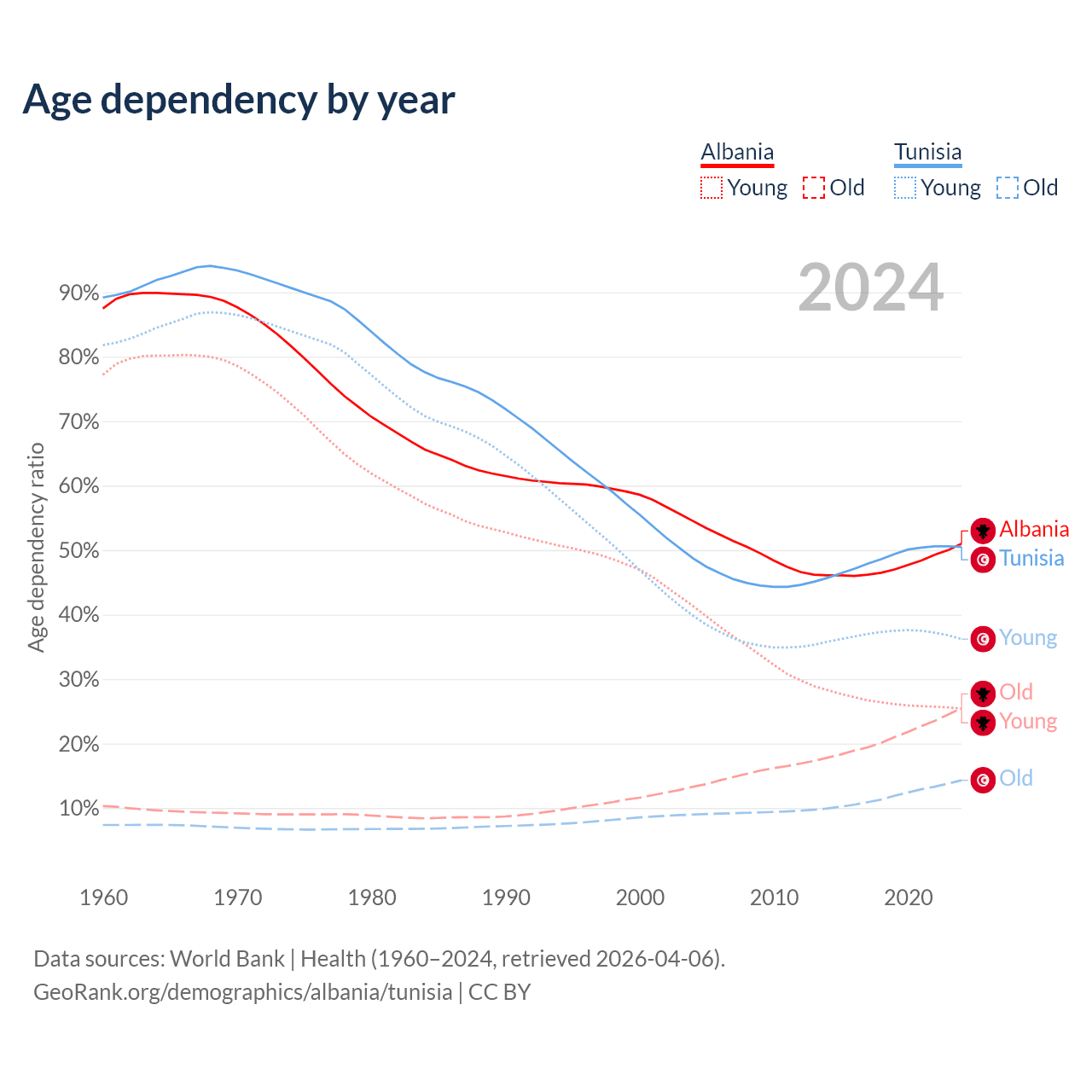 - Albania is ranked 60/196 by median age (oldest to youngest) vs 86/196 for Tunisia.