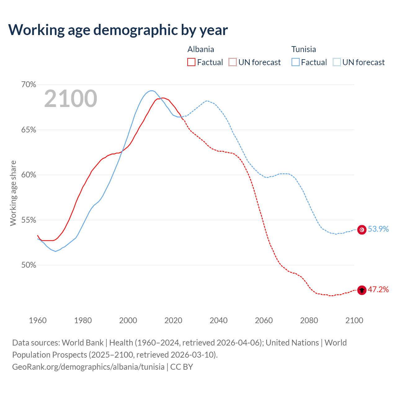- Albania has 1.55M working age adults (aged 15-64) vs 8.26M in Tunisia.