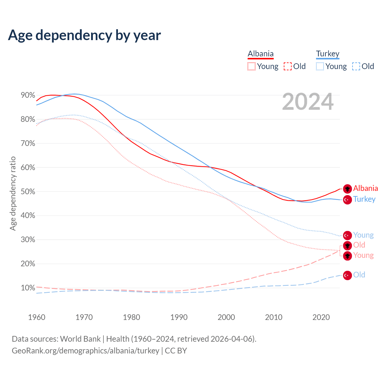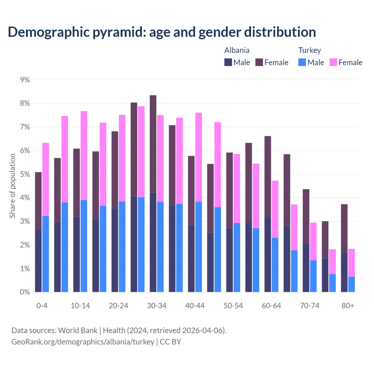 The share of older people aged 65 and over is 16.9% in Albania and 10.3% in Turkey. Life expectancy in Albania compared to Turkey .
