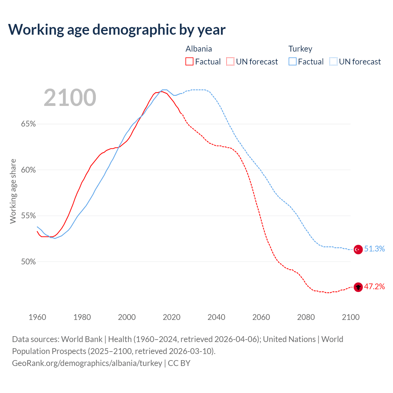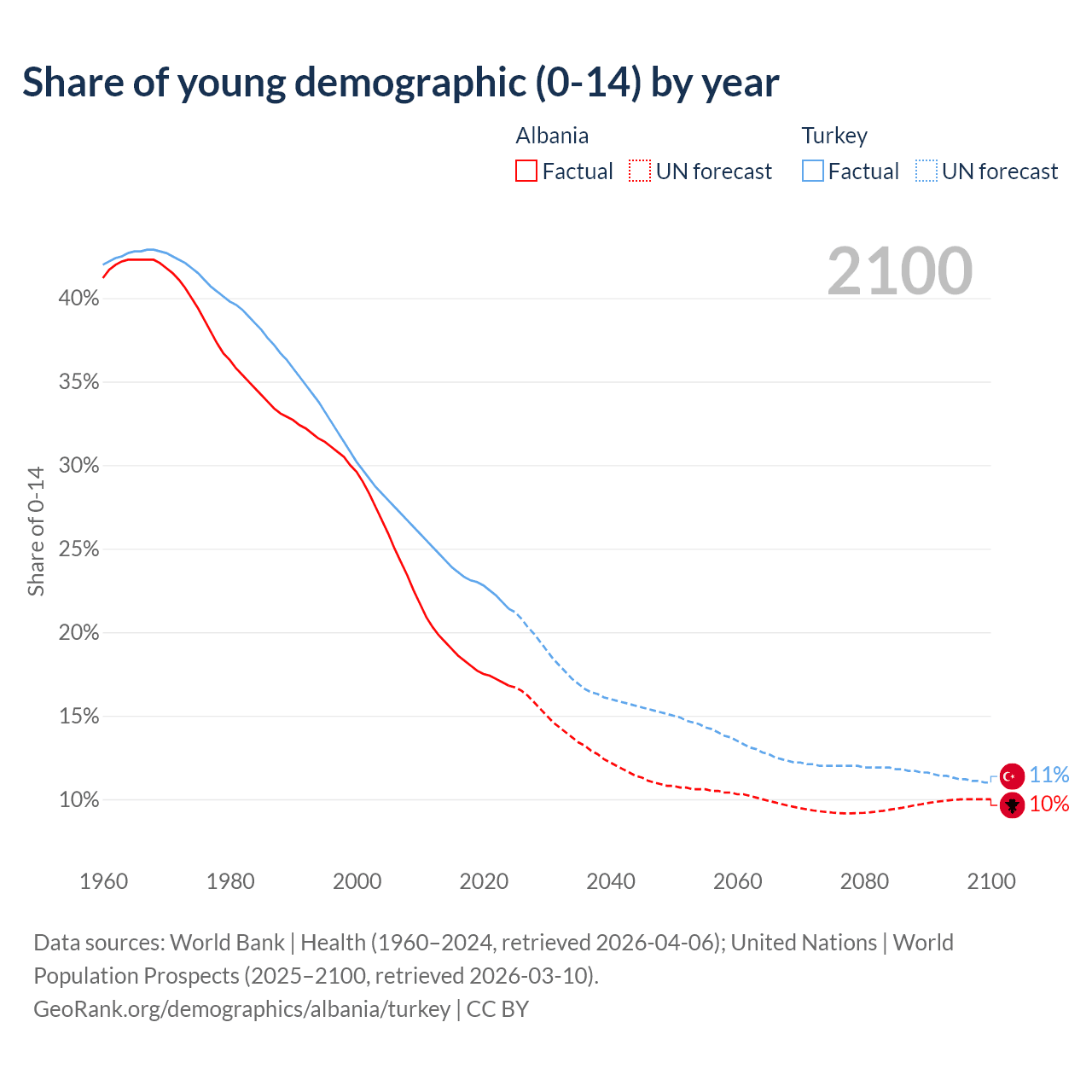 Median age Albania vs Turkey, 1960-2100