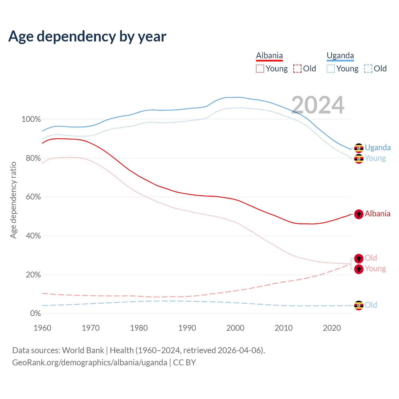 - Albania is ranked 60/196 by median age (oldest to youngest) vs 187/196 for Uganda.