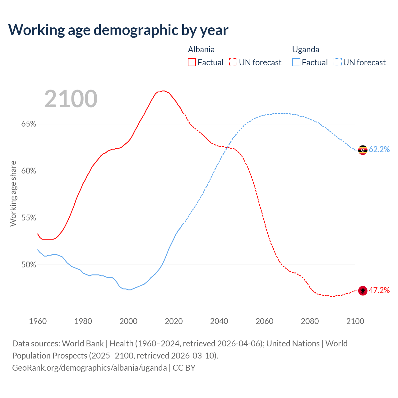 Median age Albania vs Uganda, 1960-2100