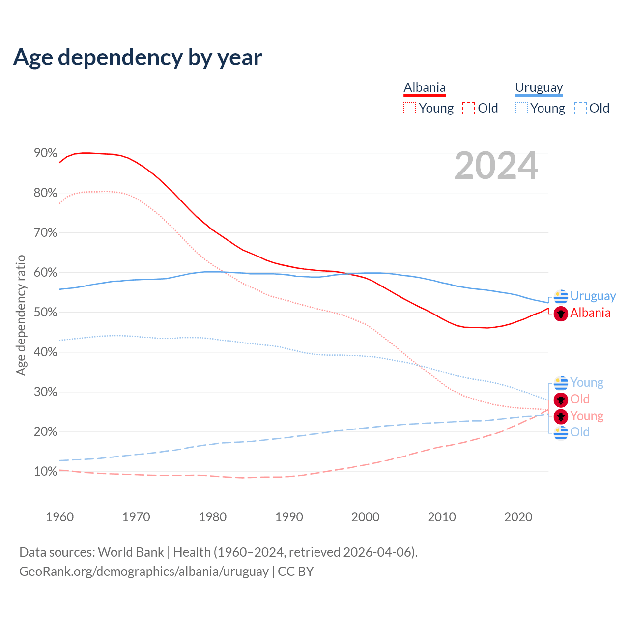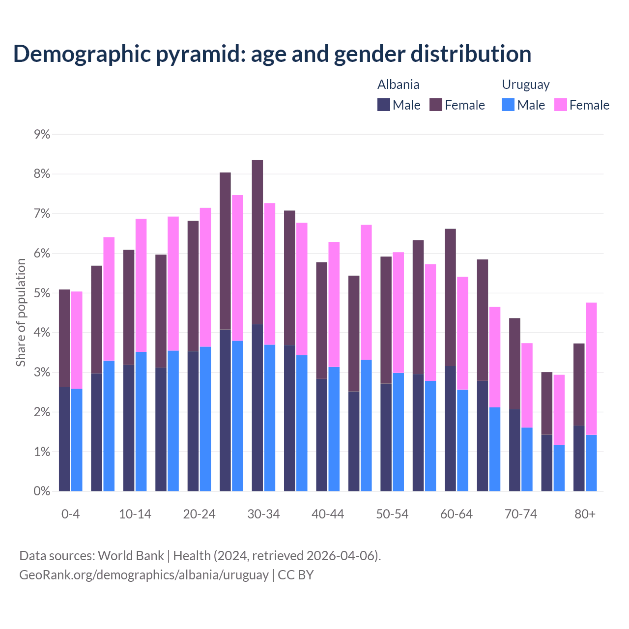 - Albania is ranked 60/196 by median age (oldest to youngest) vs 63/196 for Uruguay.