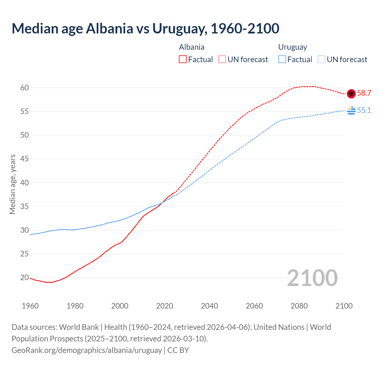 - The median age in Albania is 37.8 years compared to 37.2 years in Uruguay.