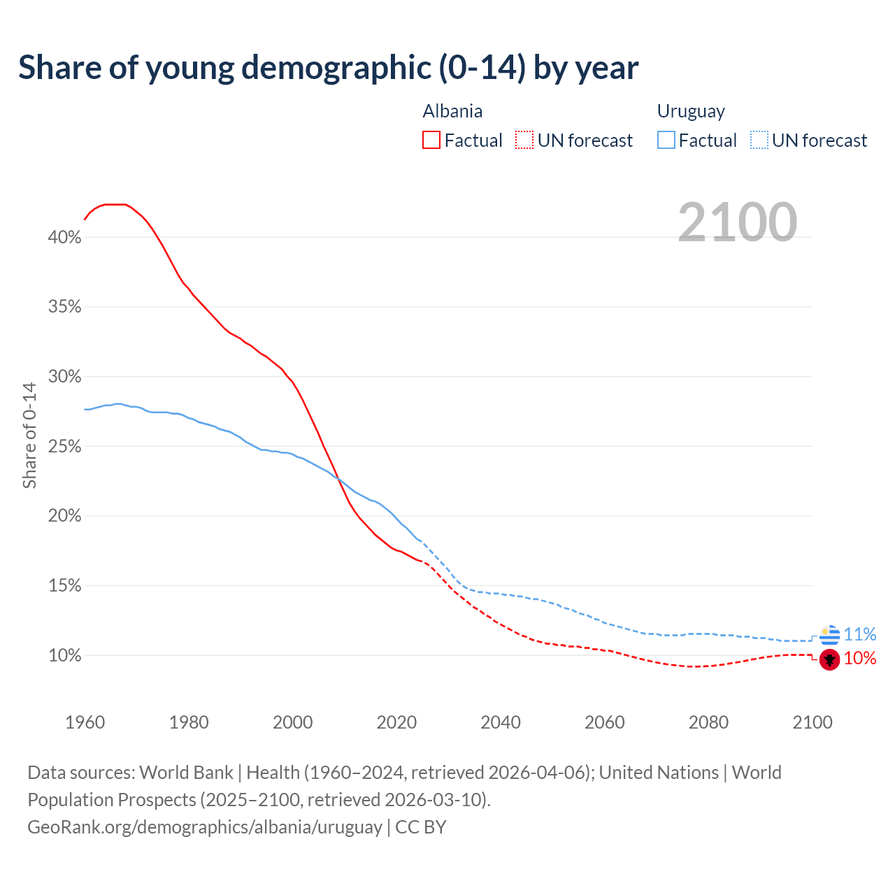 - The share of young demographic (0-15 years old) in Albania is 16.8% vs 18.3% in Uruguay.
