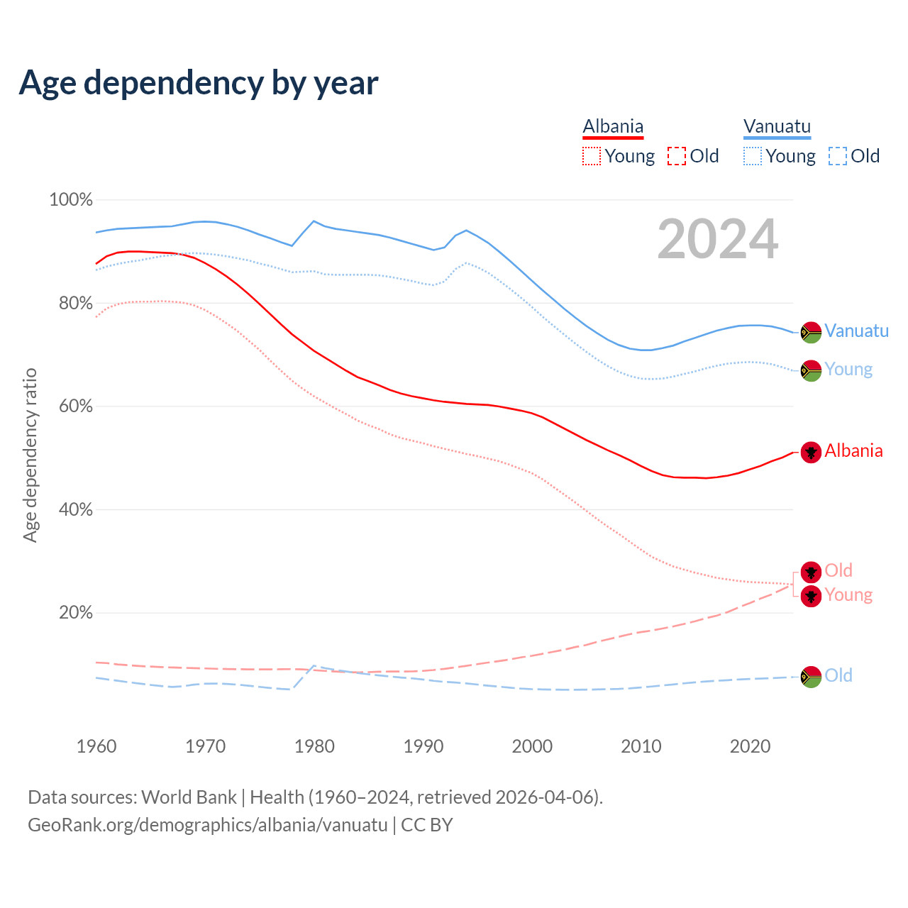 - Albania is ranked 60/196 by median age (oldest to youngest) vs 156/196 for Vanuatu.