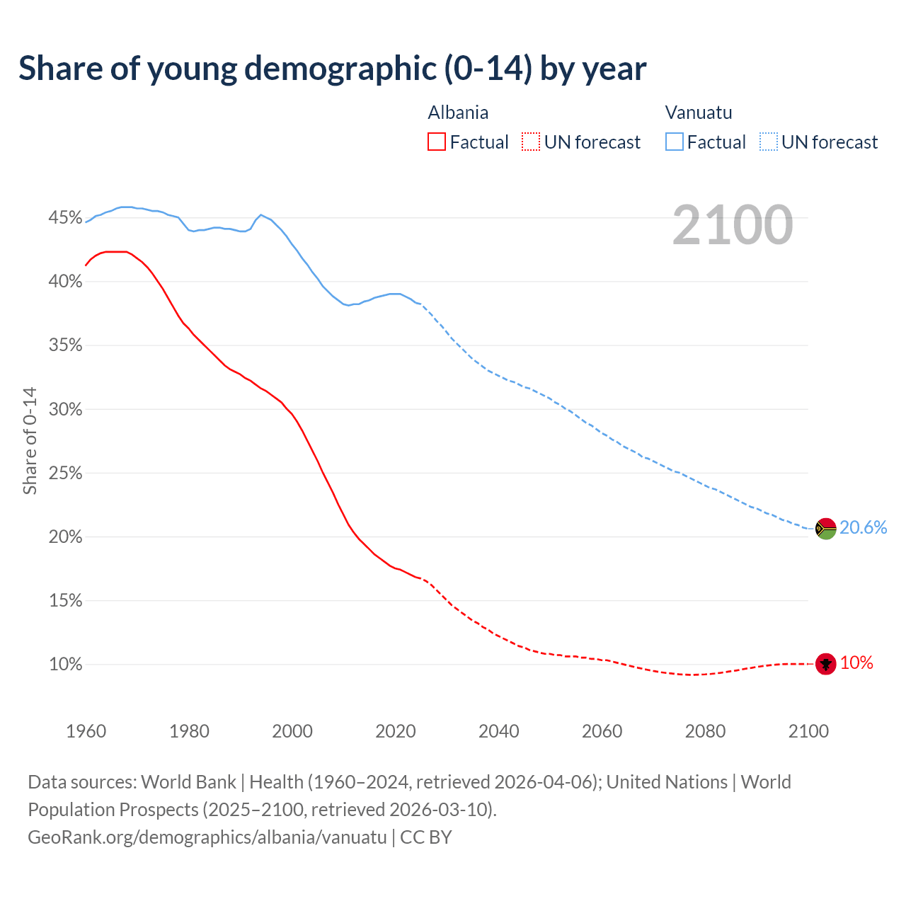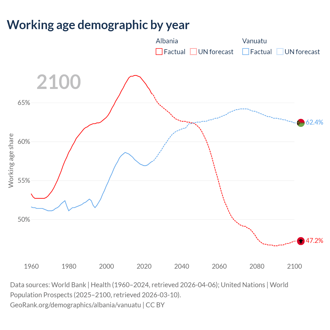Median age Albania vs Vanuatu, 1960-2100