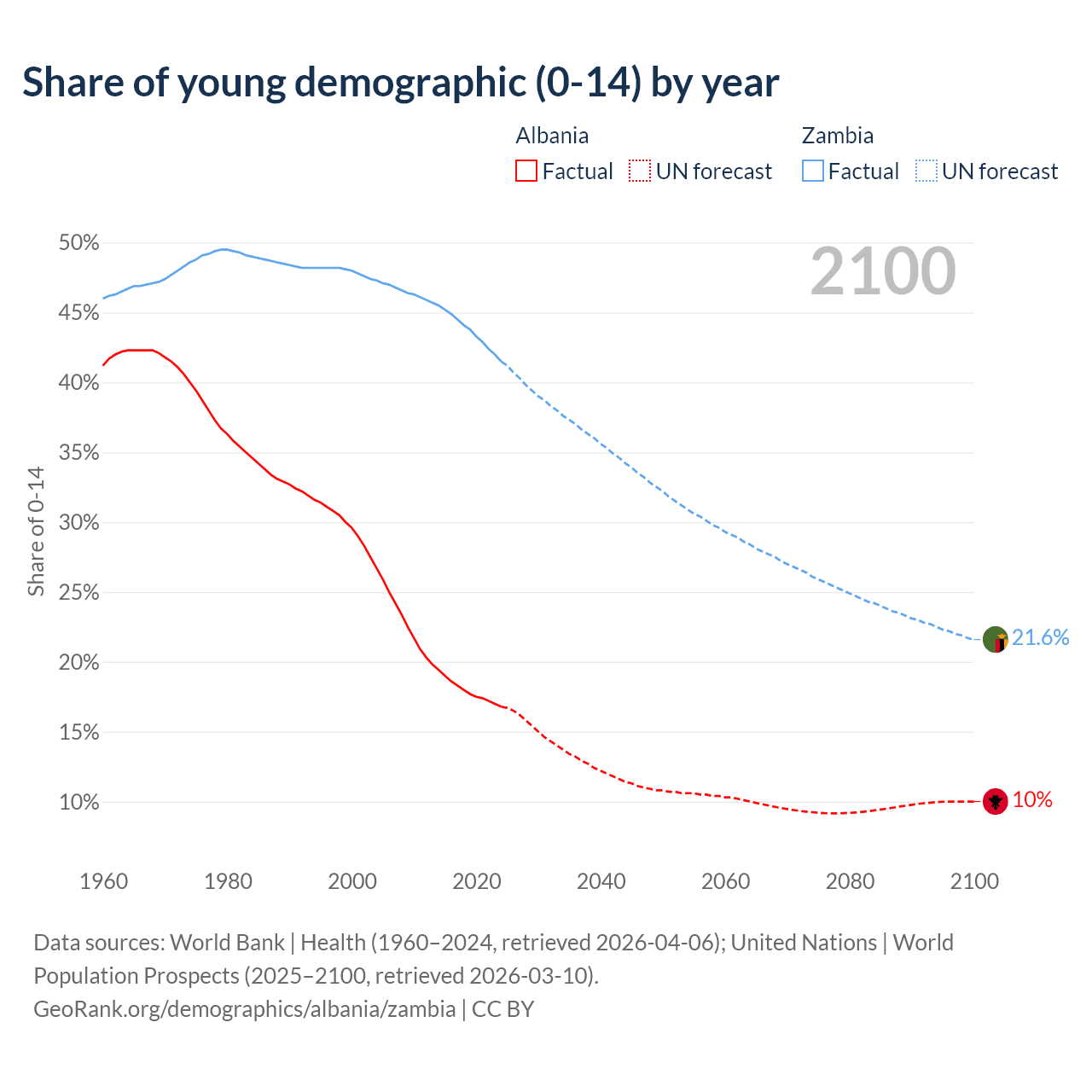 Median age Albania vs Zambia, 1960-2100