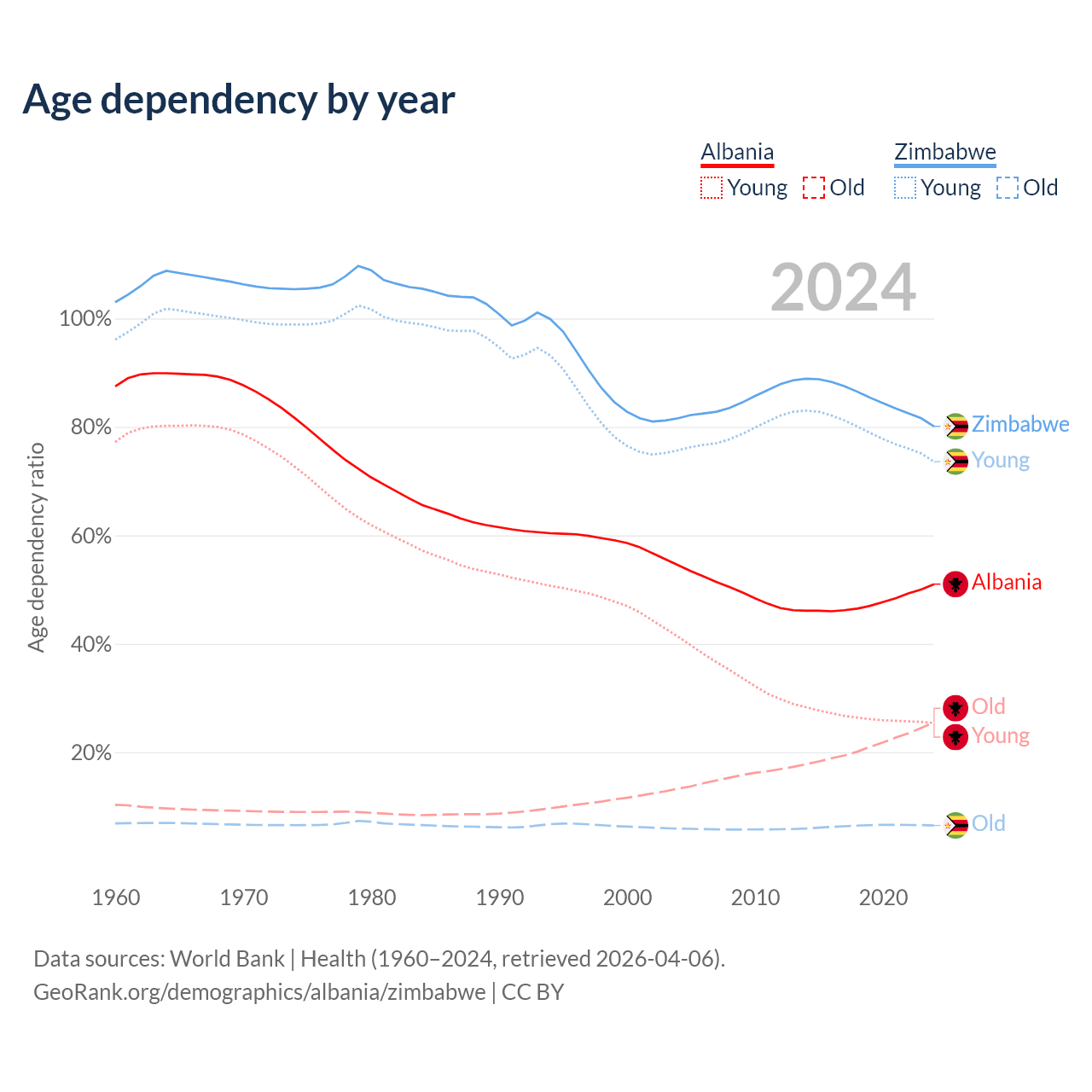 The share of older people aged 65 and over is 16.9% in Albania and 3.6% in Zimbabwe. Life expectancy in Albania compared to Zimbabwe .