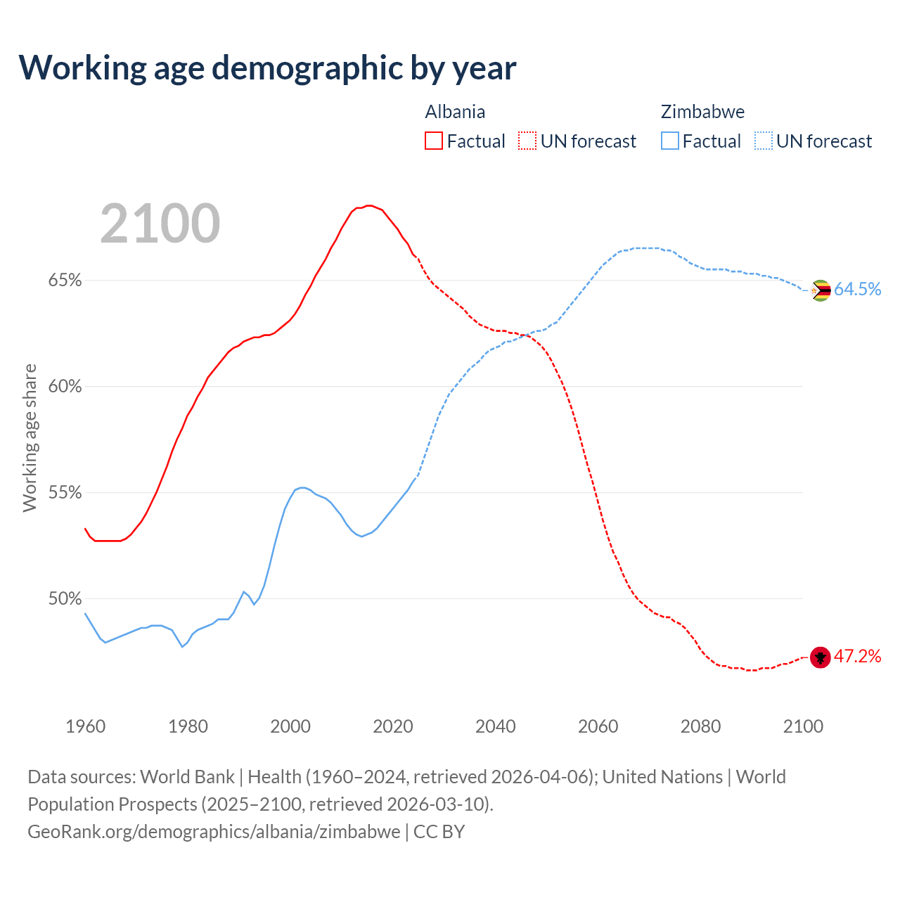 Median age Albania vs Zimbabwe, 1960-2100