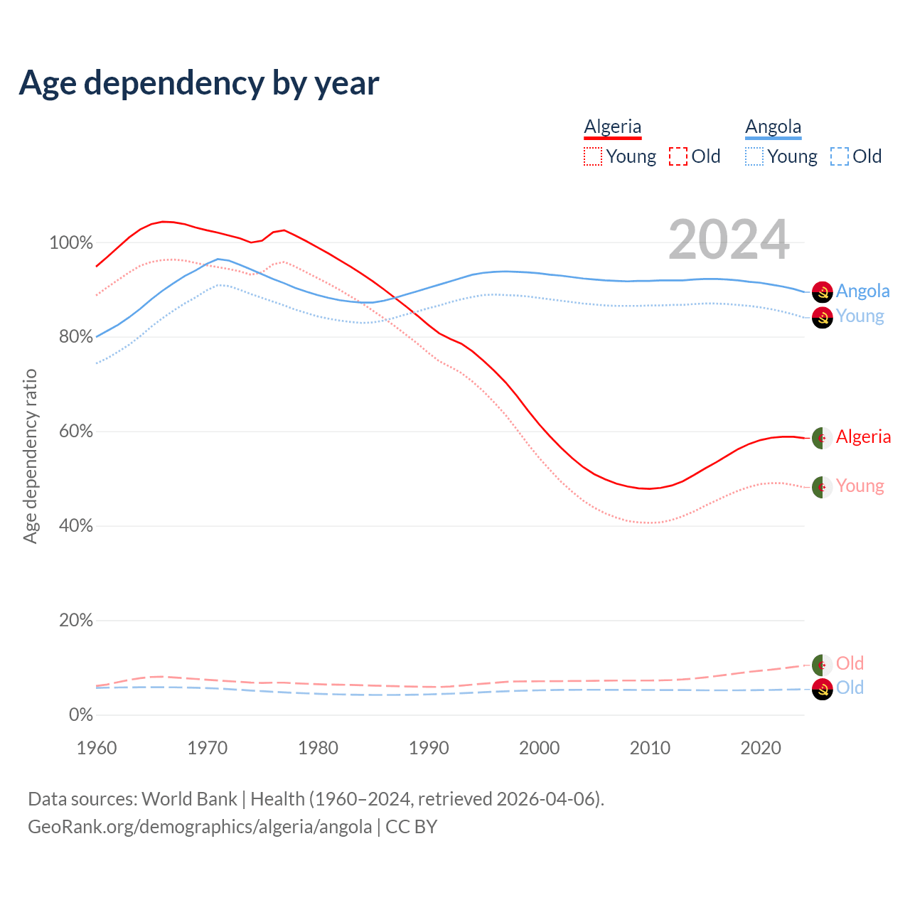 Data sources: World Bank | Health (1960–2024, retrieved 2026-04-06); U.S. Census Bureau (1960–2024, retrieved 2026-02-08).