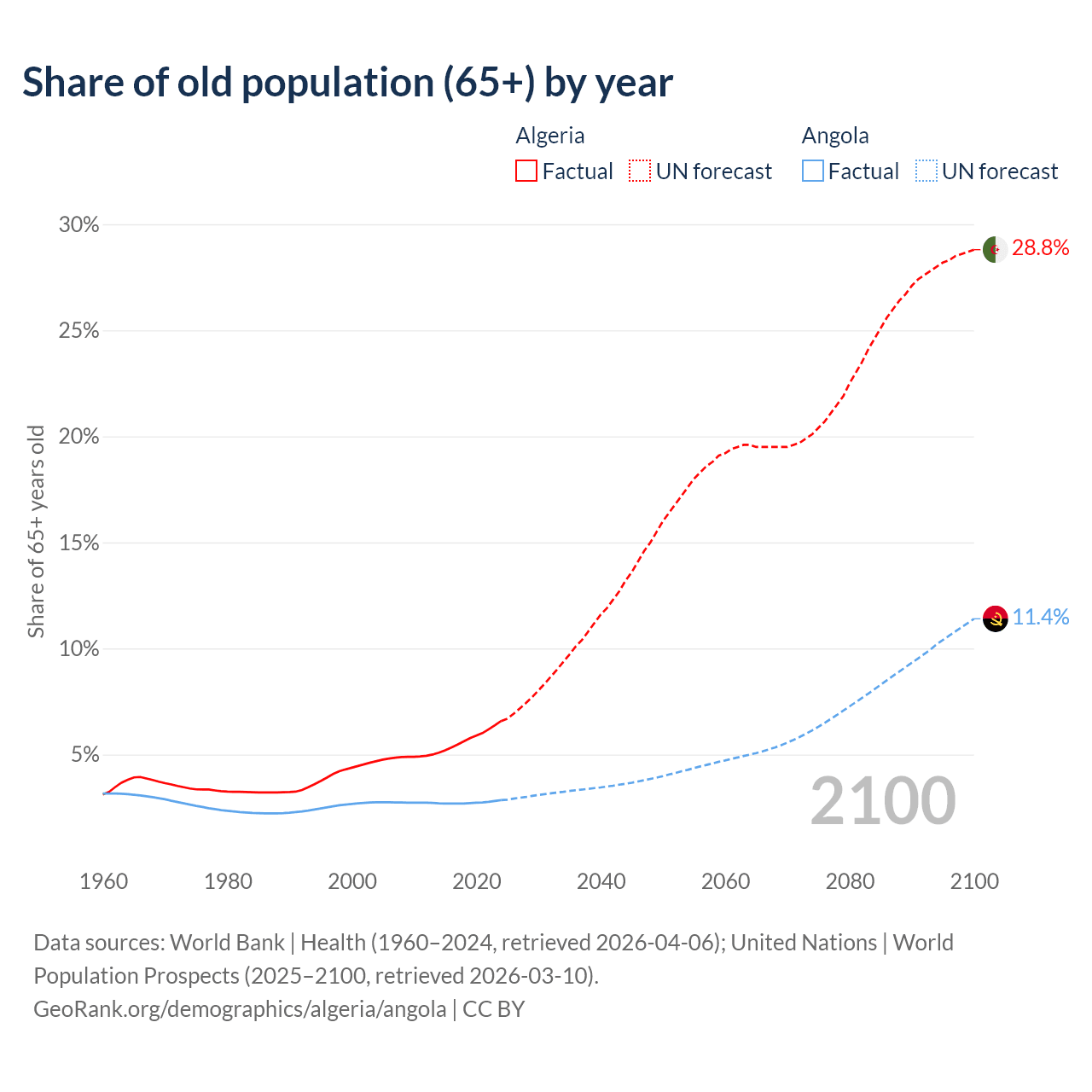 The share of older people aged 65 and over is 6.58% in Algeria and 2.85% in Angola. Life expectancy in Algeria compared to Angola .
