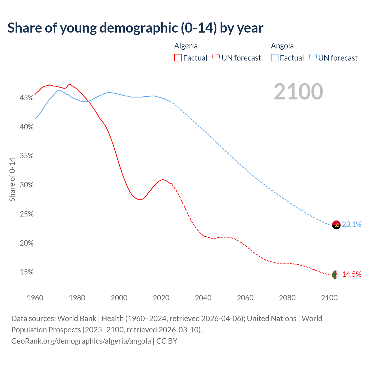 Median age Algeria vs Angola, 1960-2100
