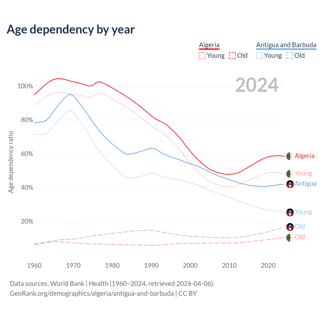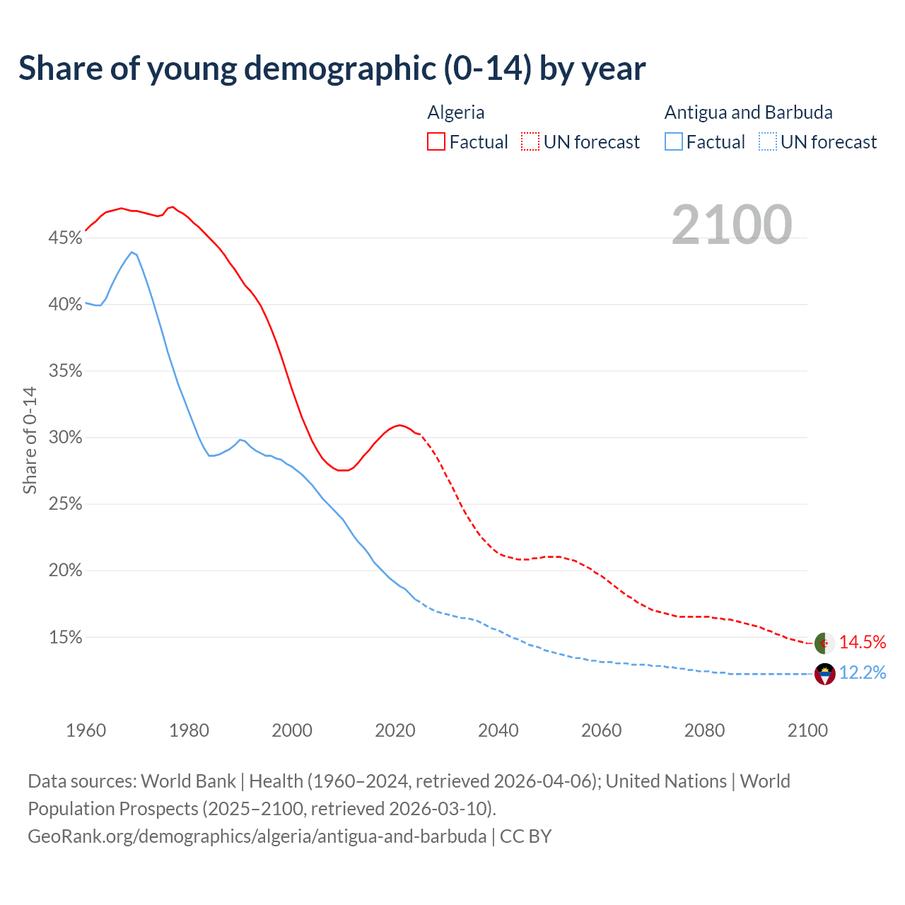 - The share of young demographic (0-15 years old) in Algeria is 30.3% vs 17.8% in Antigua and Barbuda.